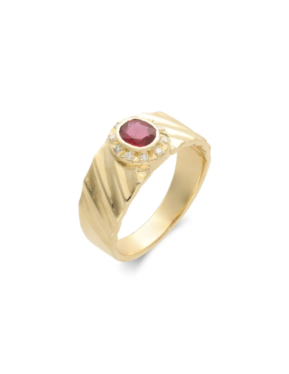 Anillo de oro amarillo 9 kt (375 mmas) con rubí oval y diamantes talla brillante.