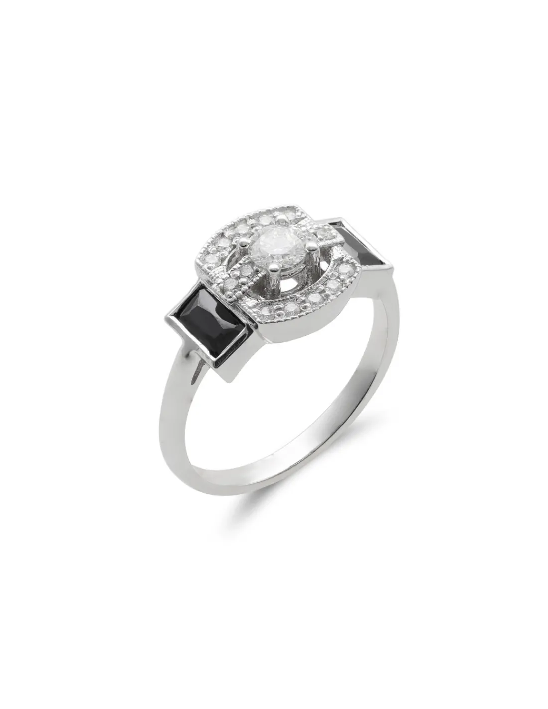 Anillo de oro blanco 1ª Ley (750 mmas) con orla de diamantes y ónix talla baguette. Una joya que captura el espíritu de Eclipsia: el equilibrio entre el misterio de la oscuridad y la intensidad de la luz.