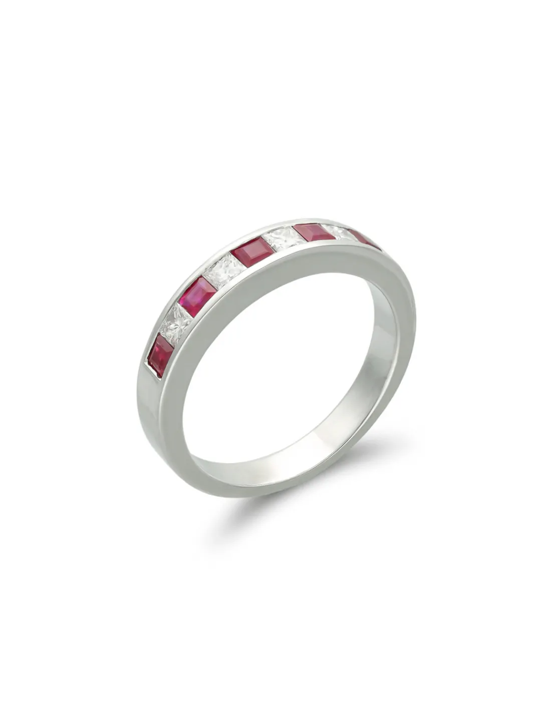 Anillo de oro blanco 1ª ley (750 mmas) tipo media alianza combinado con rubíes talla carré y diamantes talla princesa engastados en carril. Una joya que transmite lujo y elegancia gracias a la combinación de sus piedras. Talla 13.