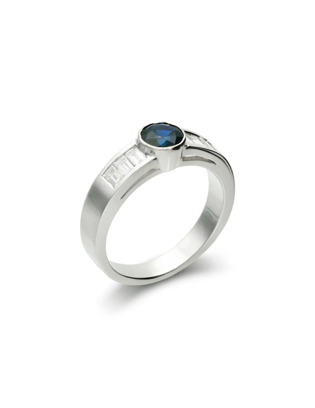 Anillo de oro blanco 1ª Ley (750 mmas) con zafiro natural redondo y diamantes talla baguette. Una joya con carisma y elegantes reflejos de luz.