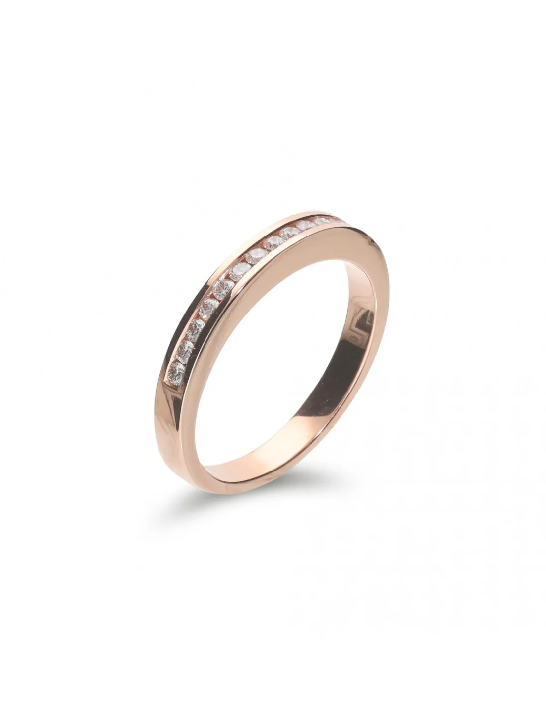 Anillo de oro rosa 1ª Ley (750 mmas) con aro cuadrado y diamantes engastados en carril. Un diseño de media alianza. Talla 13.