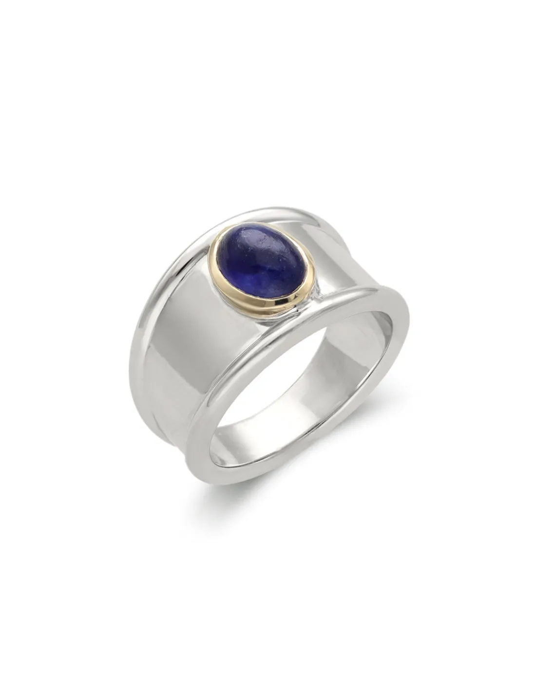 Anillo de plata 1ª Ley (925 mmas) con aro ancho combinado con un zafiro talla oval cabujón engastado en boquilla de oro amarillo de 9 kt. Talla 13.