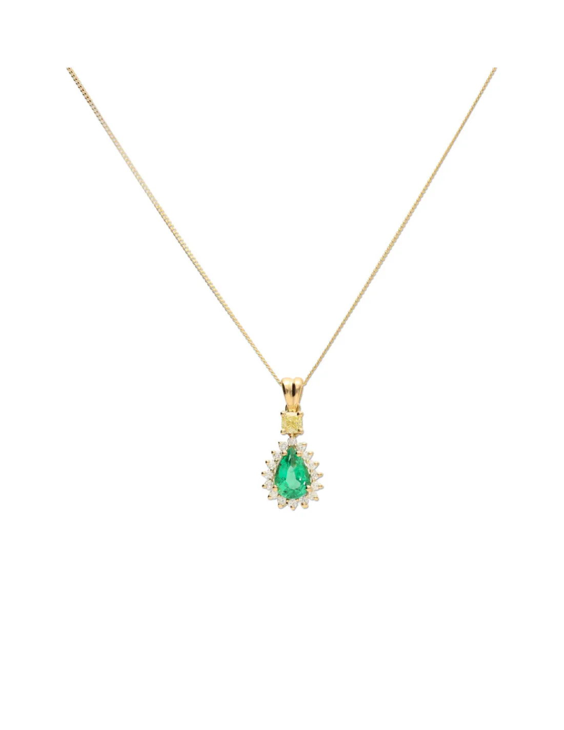 Cadena-Colgante de oro amarillo 1ª Ley (750 mmas) con diamante fancy y esmeralda natural talla pera engastados en garras acompañados de diamantes talla brillante. Tamaño aproximado del colgante incluyendo reasa 2 cm. Largo cadena 45,5 cm.