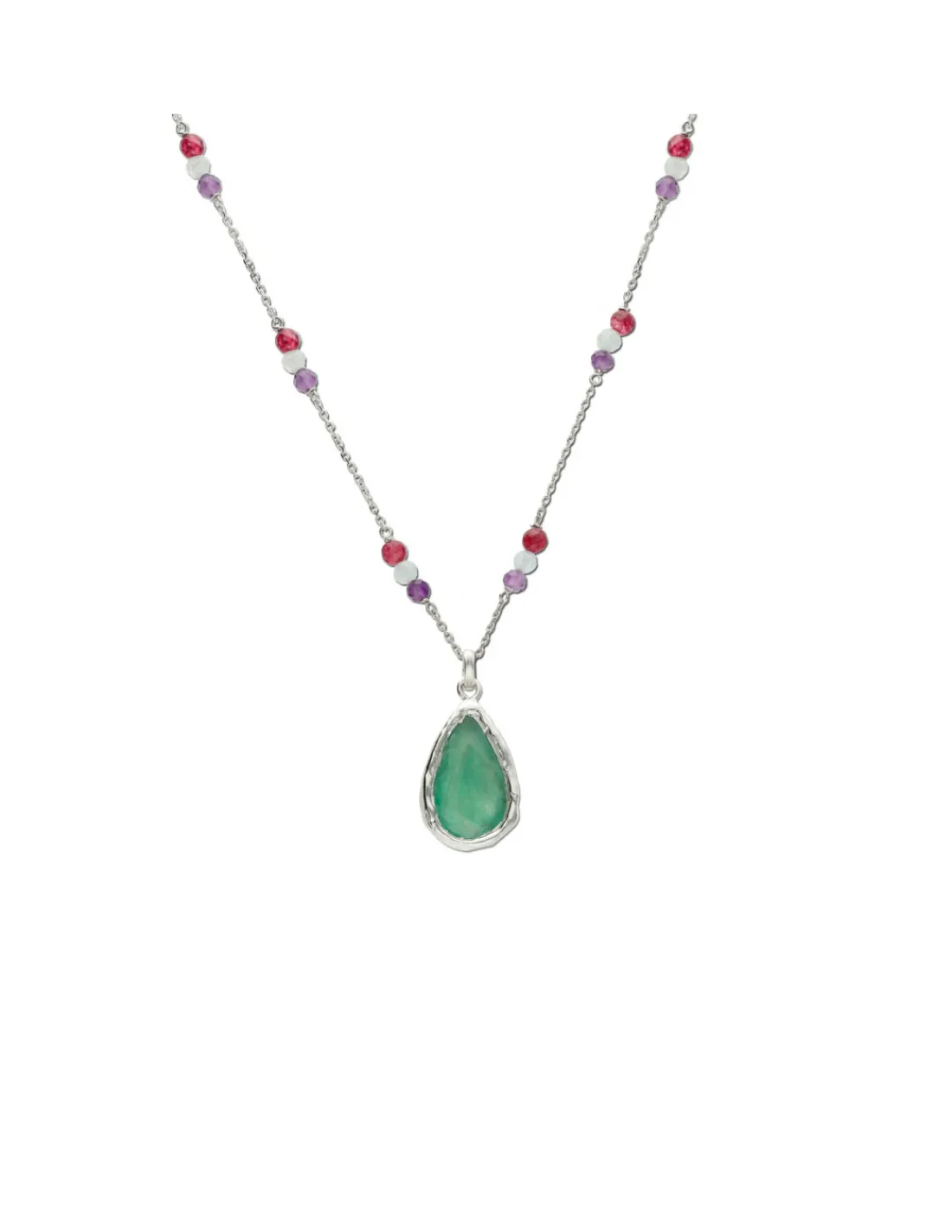 Colgante y cadena de plata 1ª Ley (925 mmas) que combina varias aguamarinas, amatistas y jade rojo con una esmeralda.