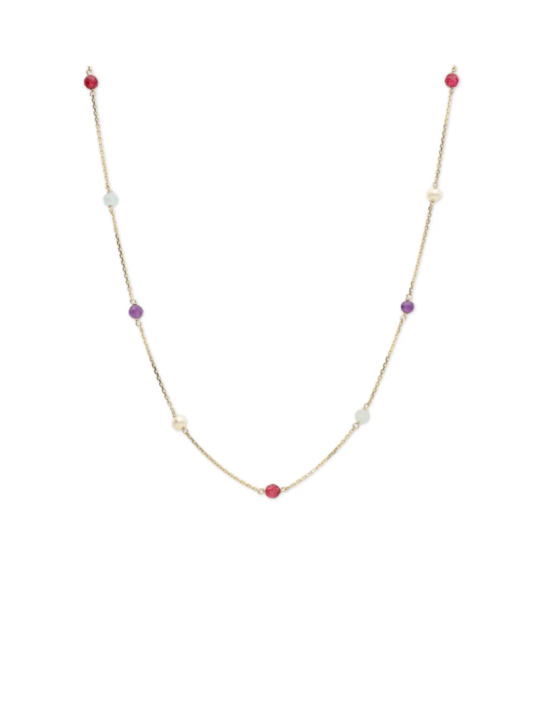 Gargantilla de oro amarillo 9 kt (375 mmas) combinada con perlas de agua dulce, amatistas, aguamarinas y jade rojo. Una pieza minimalista perfecta para combinar con otras joyas. Largo cadena 41,5 cm.