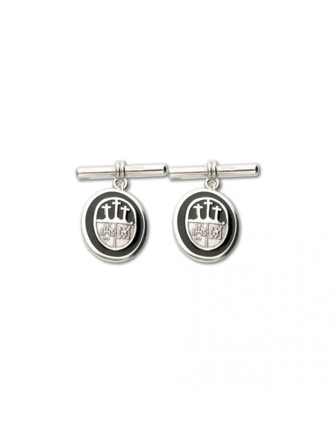 Gemelos de plata 1ª Ley (925 mmas) con esmalte negro y escudo de la Hermandad del Calvario de Sevilla.