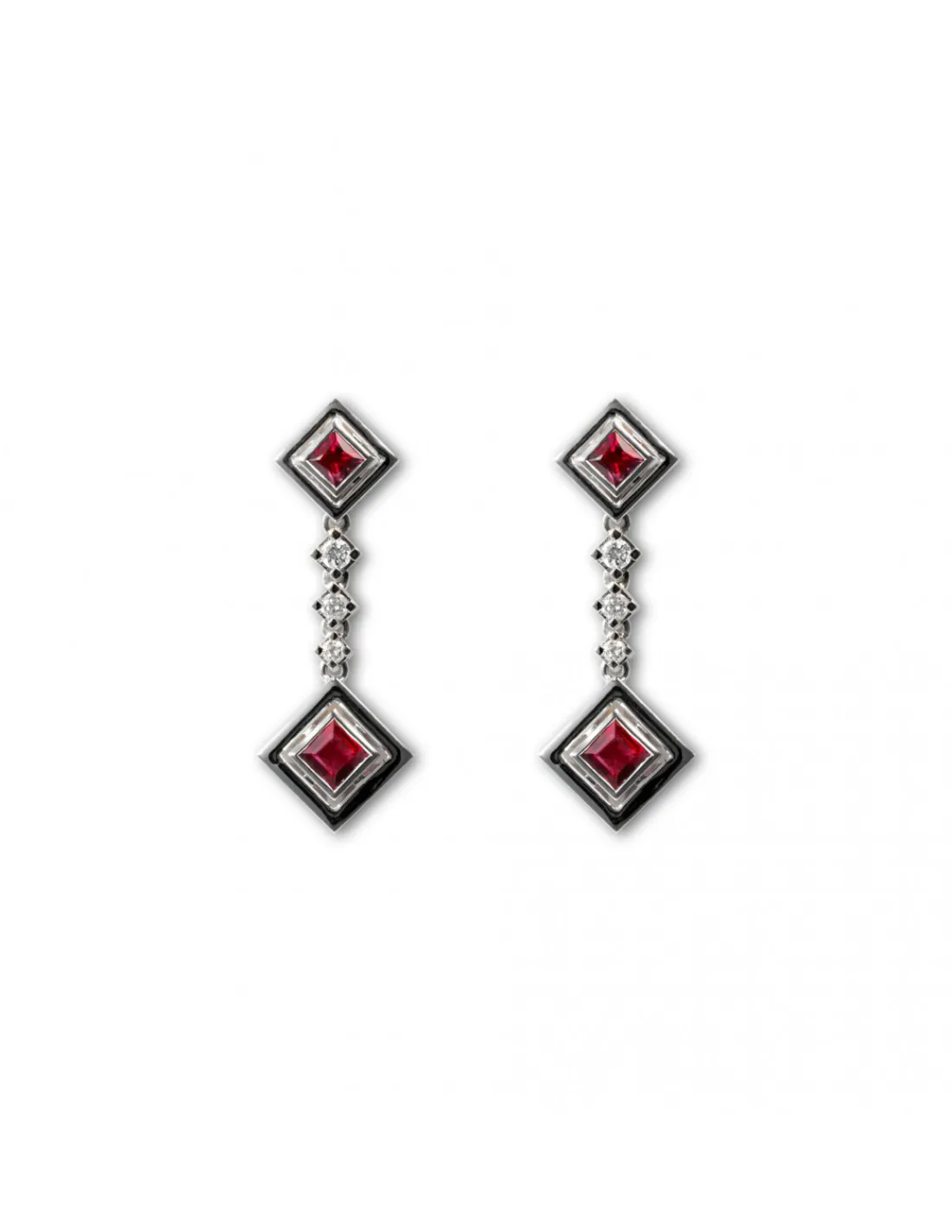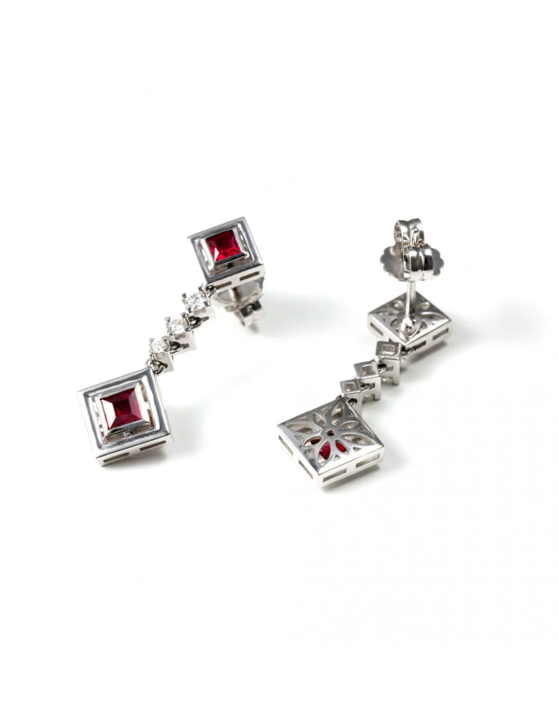 Pendientes Oro Blanco 1ª Ley (750 mmas) con rubies talla cuadrada engastados en boquilla y diamantes talla brillante engastados en garras. Largo del pendiente ( 3,5 cm).