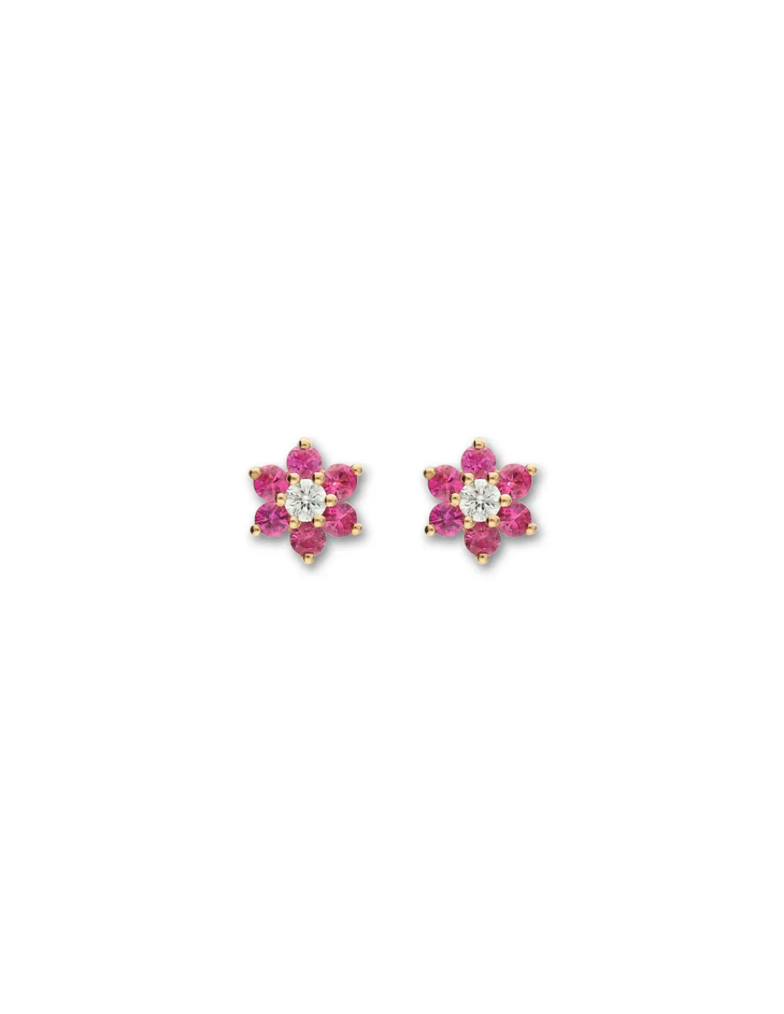 Pendientes de oro amarillo 1ª Ley (750 mmas) con diseño de flor y diamante talla brillante engastado en el centro rodeado por rubíes redondos. Una pieza original llena de color perfecta para cualquier ocasión.