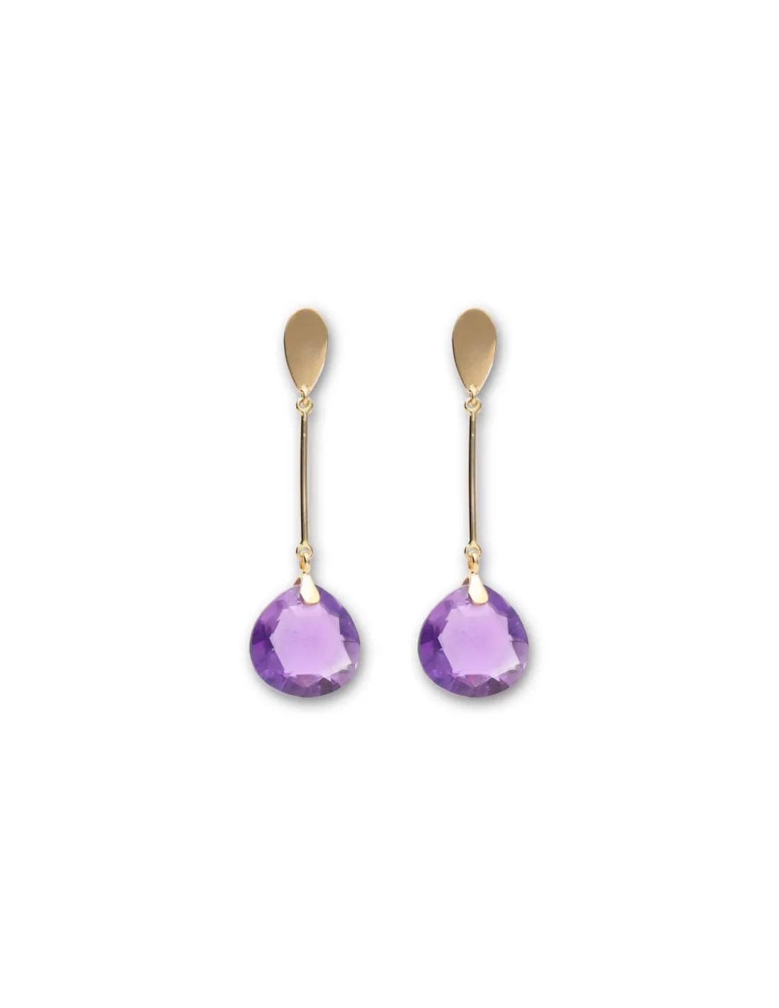 Pendientes de oro amarillo 1ª Ley (750 mmas) combinados con amatista talla pera briolette. Cierre de palillo y presión. Largo aproximado 4,1 cm.