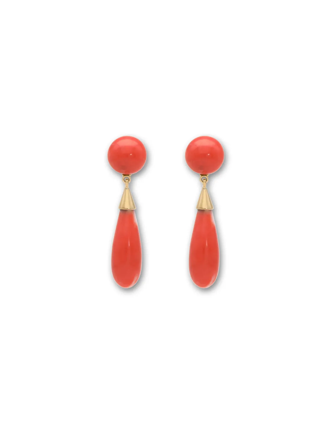 Pendientes de oro amarillo 1ª Ley (750 mmas) con botón de coral del que cuelga una lágrima de coral.