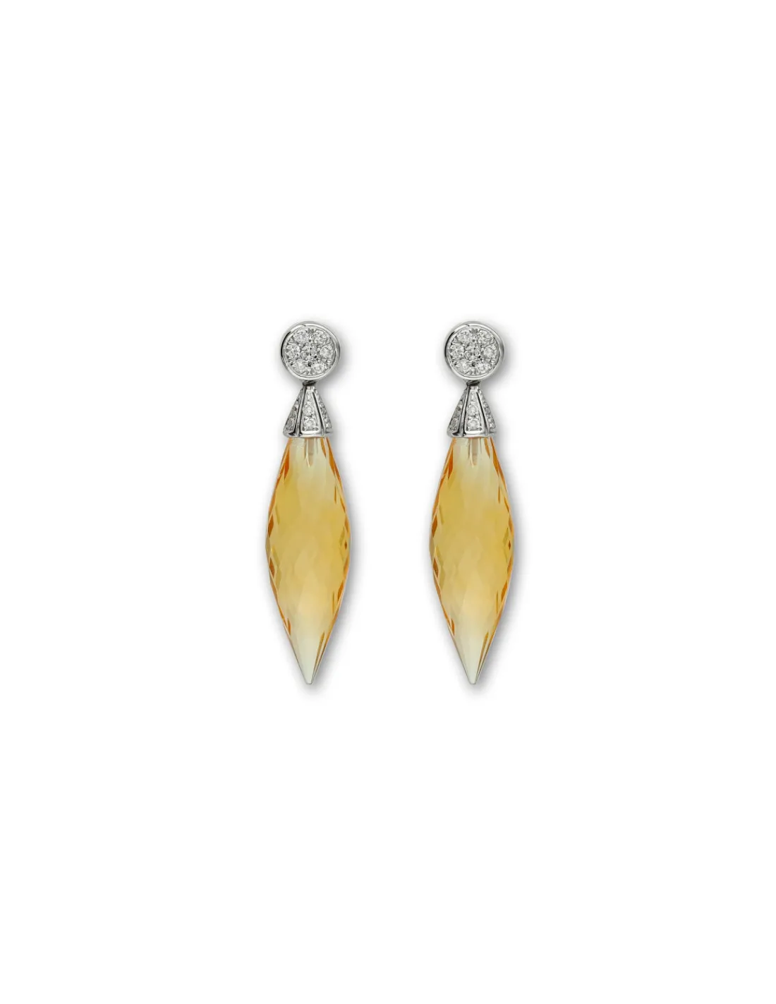 Pendientes de oro blanco 1ª Ley (750 mmas) con diamantes talla brillante y citrino briolette. La opción idónea para fuertes personalidades.
