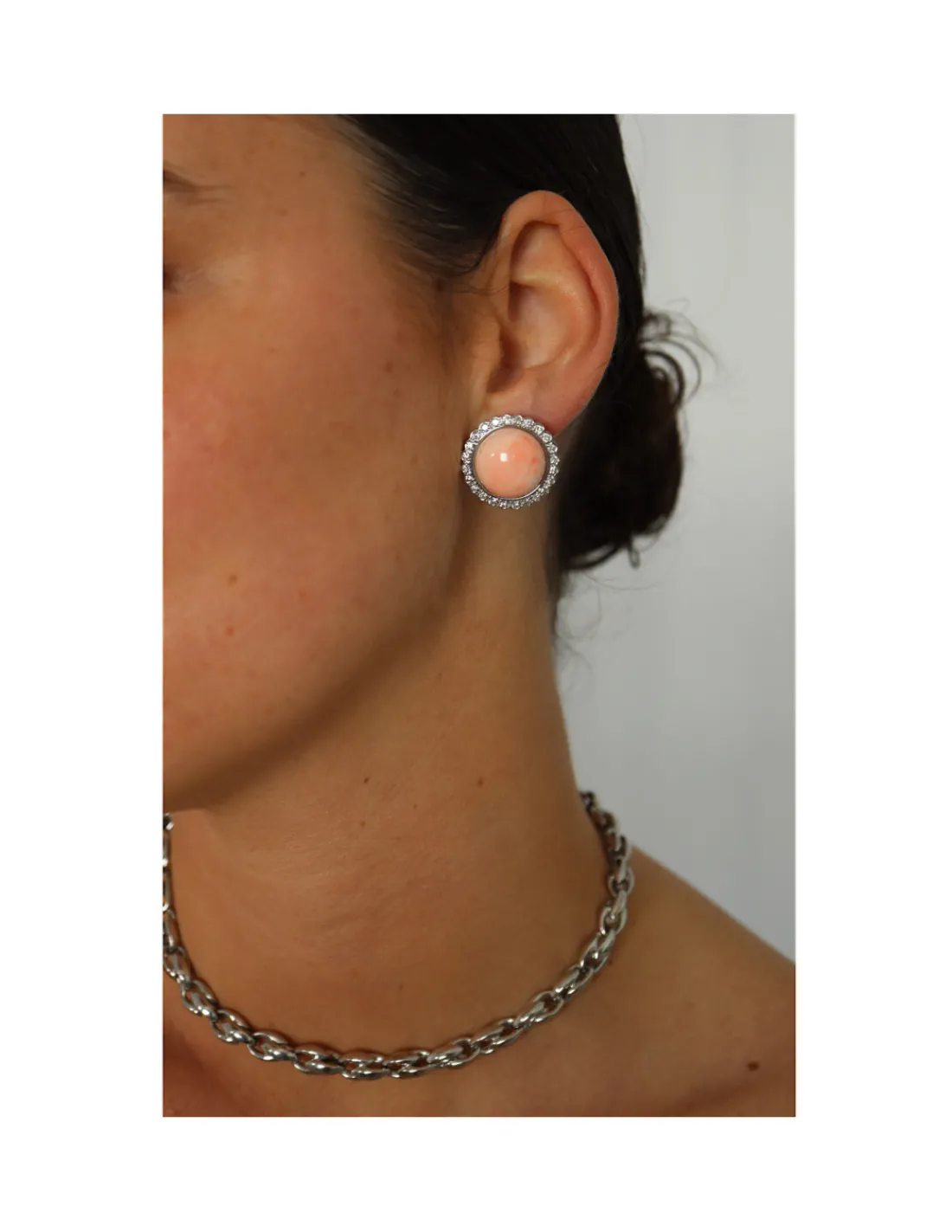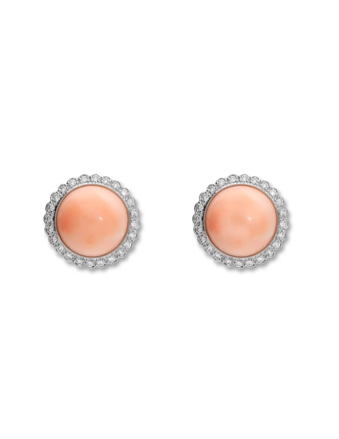 Pendientes de oro blanco 1ª Ley (750 mmas) con coral piel de ángel rodeado de diamantes. Una joya con espíritu femenino perfecta para las ocasiones más especiales.