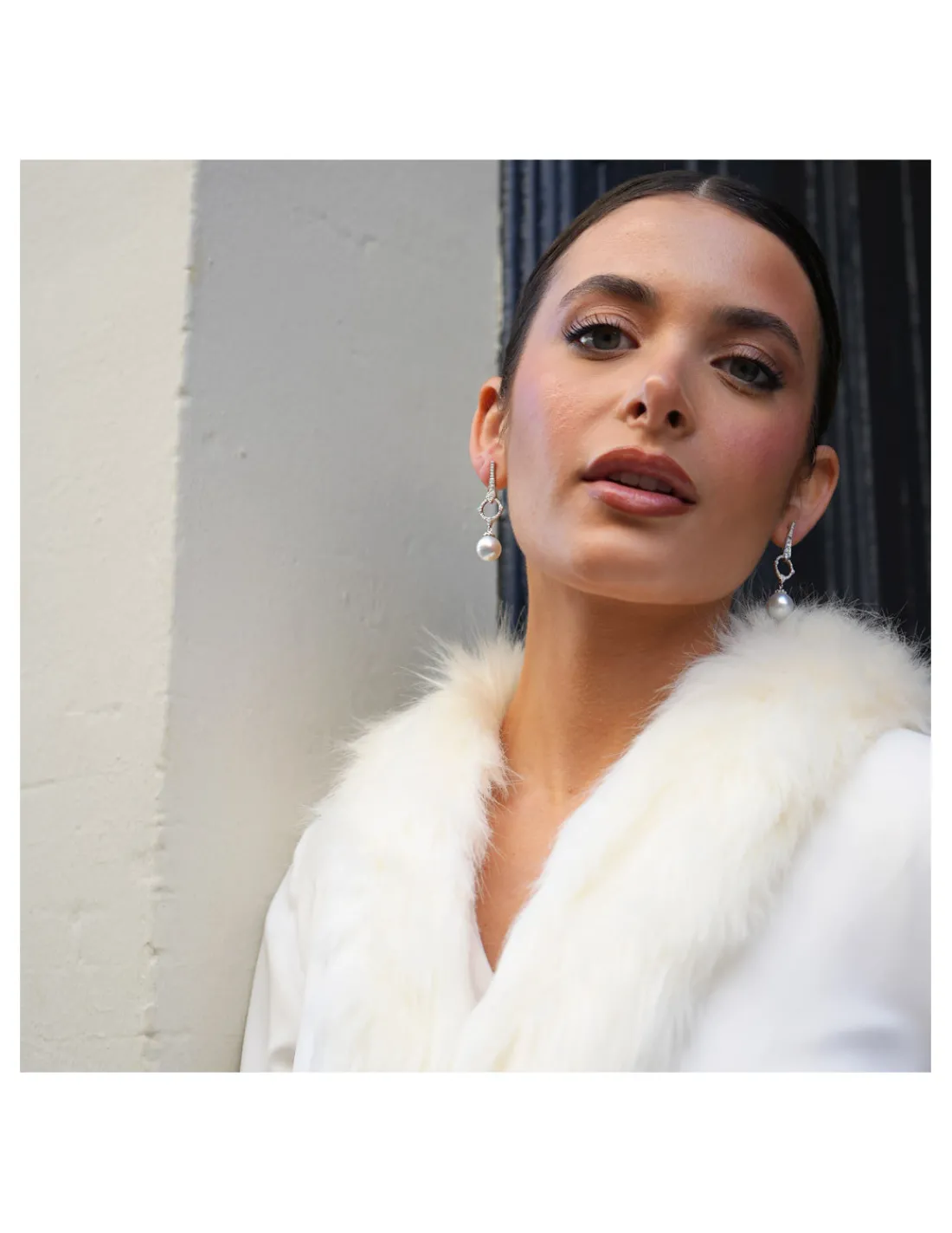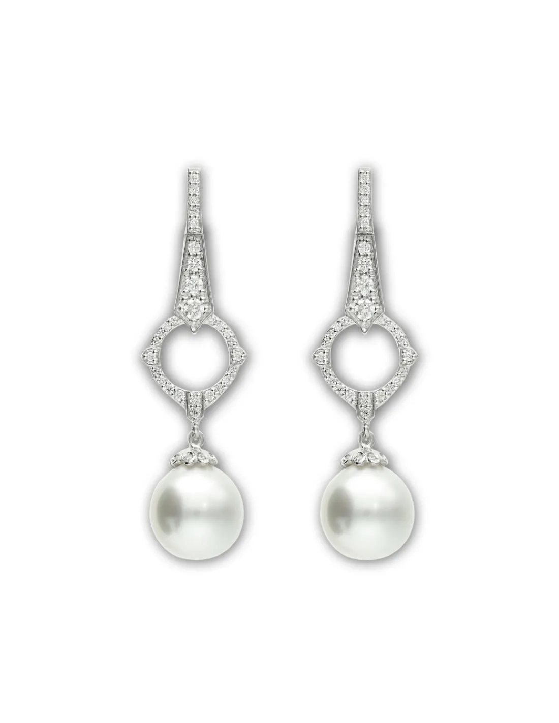 Pendientes de oro blanco 1ª Ley (750 mmas) que combina un diseño art deco con diamantes talla brillante y perla australiana. Una joya inspirada en el clasicismo atemporal para novias.