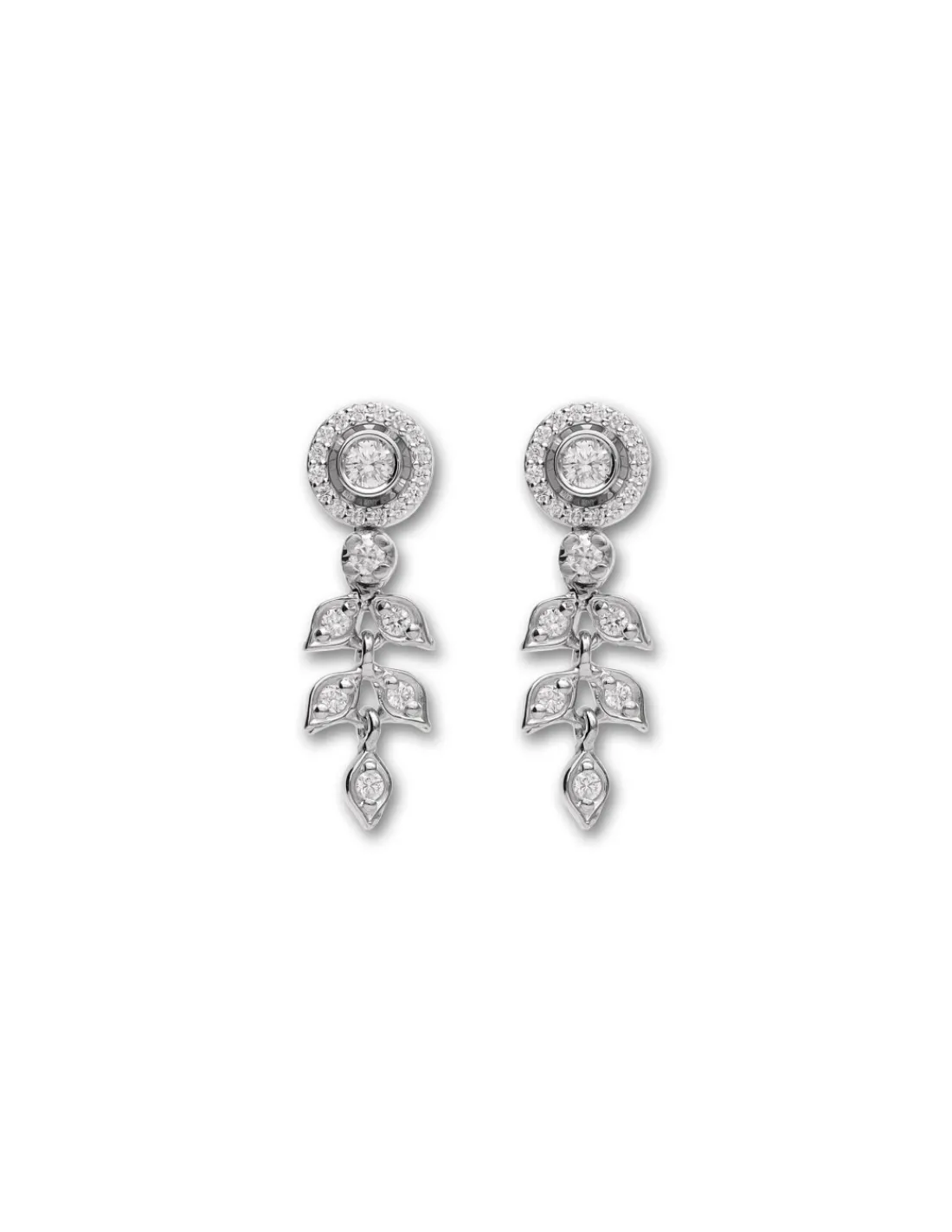 Pendientes de oro blanco 1ª Ley (750 mmas) con roseta desmontable de diamantes talla brillante de la que cuelgan hojas con diamantes engastados. Una joya muy versátil que puedes usar en cualquier ocasión gracias a su opción desmontable.
