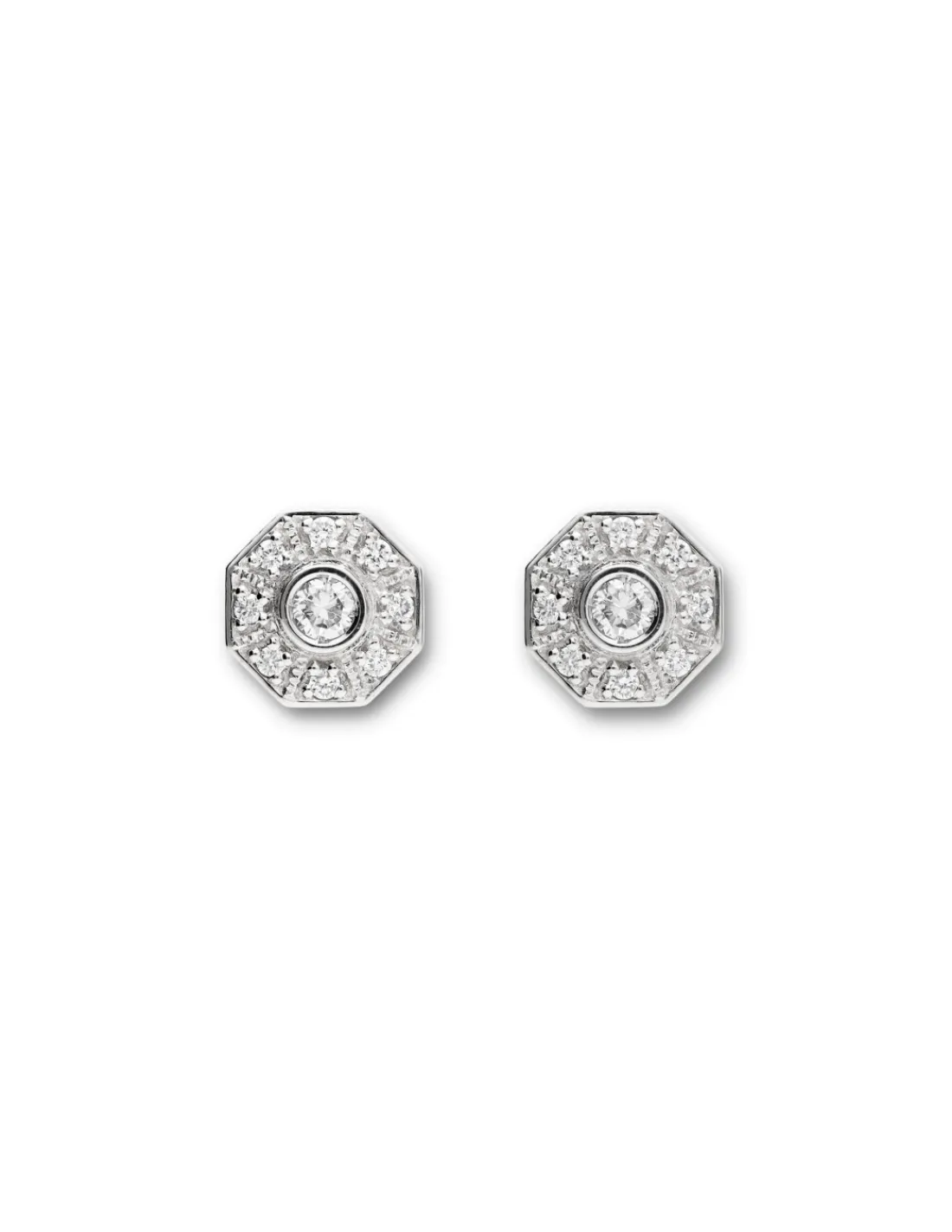 Pendientes de oro blanco 1ª Ley (750 mmas) con roseta de diamantes talla brillante. Una pieza ideal para novias que representan la máxima expresión de la elegancia y la simplicidad.