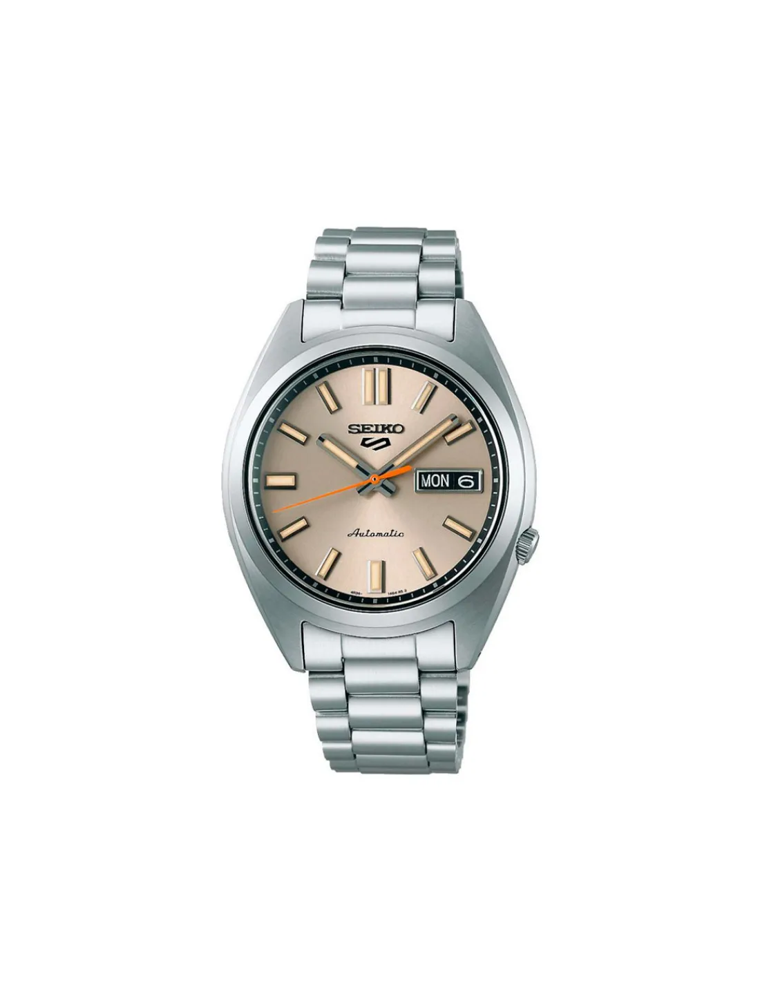 Reloj Seiko 5 Sports SNXS series con caja de de acero inoxidable de 37,4 mm de diámetro, esfera color marfil con Lumibrite en agujas e índices, cristal de Hardlex curvado y brazalete de acero. Calibre 4R36. Movimiento automático con 41 horas de reserva de marcha aproximadamente.