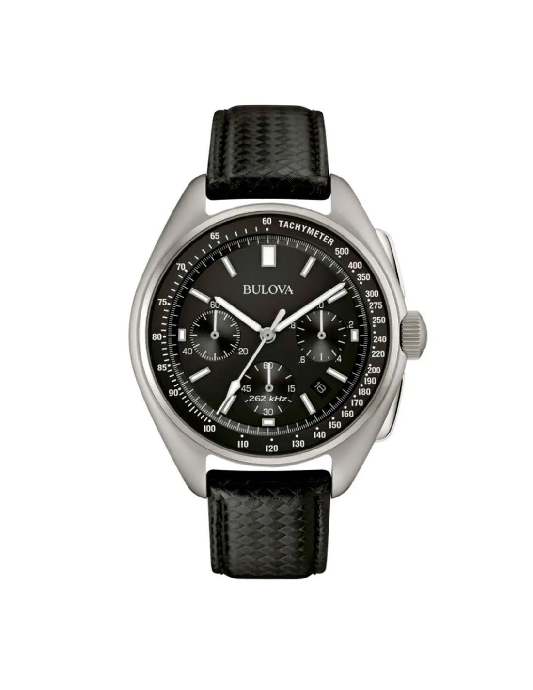 Reloj Bulova Lunar Pilot cronógrafo para hombre con caja de acero de 45 mm, esfera color negra con fondo a rosca y cristal de zafiro combinado con correa de piel negra. Movimiento de cuarzo. Correa adicional de nylon.
