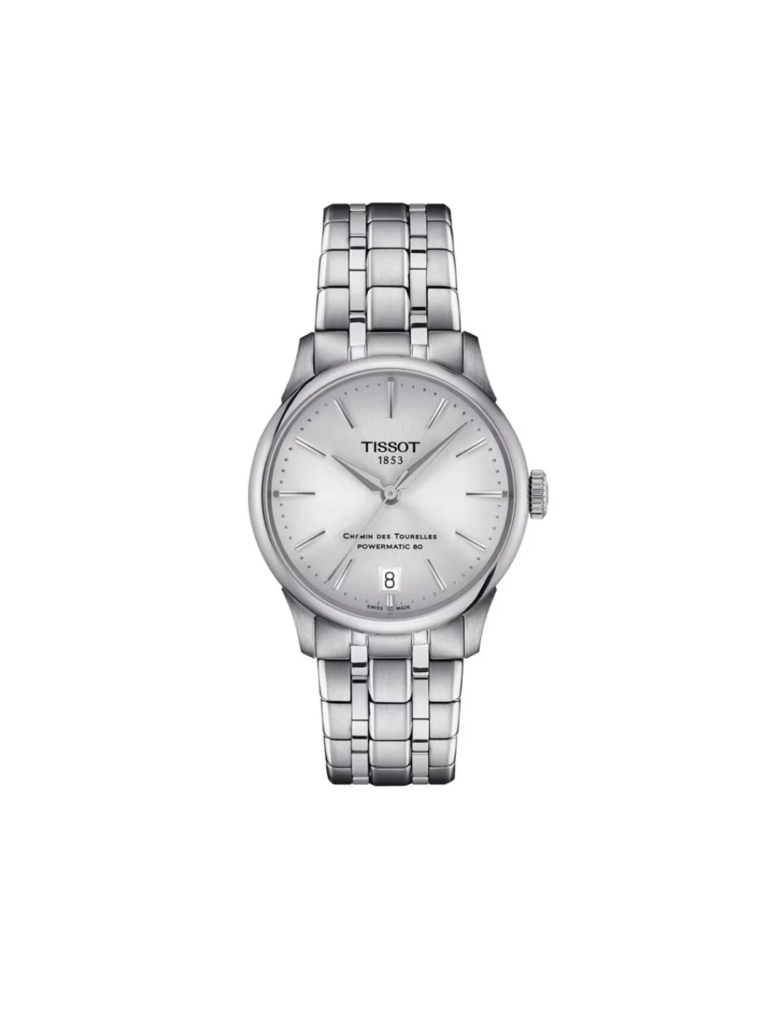 Reloj Tissot Chemin Des Tourelles Powermatic 80 con caja de acero de 34 mm de diámetro, esfera plateada con índices de bastón sencillos y elegantes combinado con brazalete. Un reloj elegante para todos los tiempos. Movimiento automático Swiss Made con 80 horas de reserva de marcha y resorte de equilibrio Nivcharon patentado.