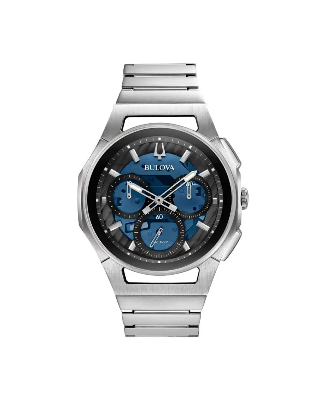 Reloj Bulova Curv Progressive cronógrafo para hombre con caja de acero de 44 mm, esfera color azul con fondo transparente con movimiento a la vista y cristal de zafiro combinado con brazalete de acero. Movimiento de cuarzo.