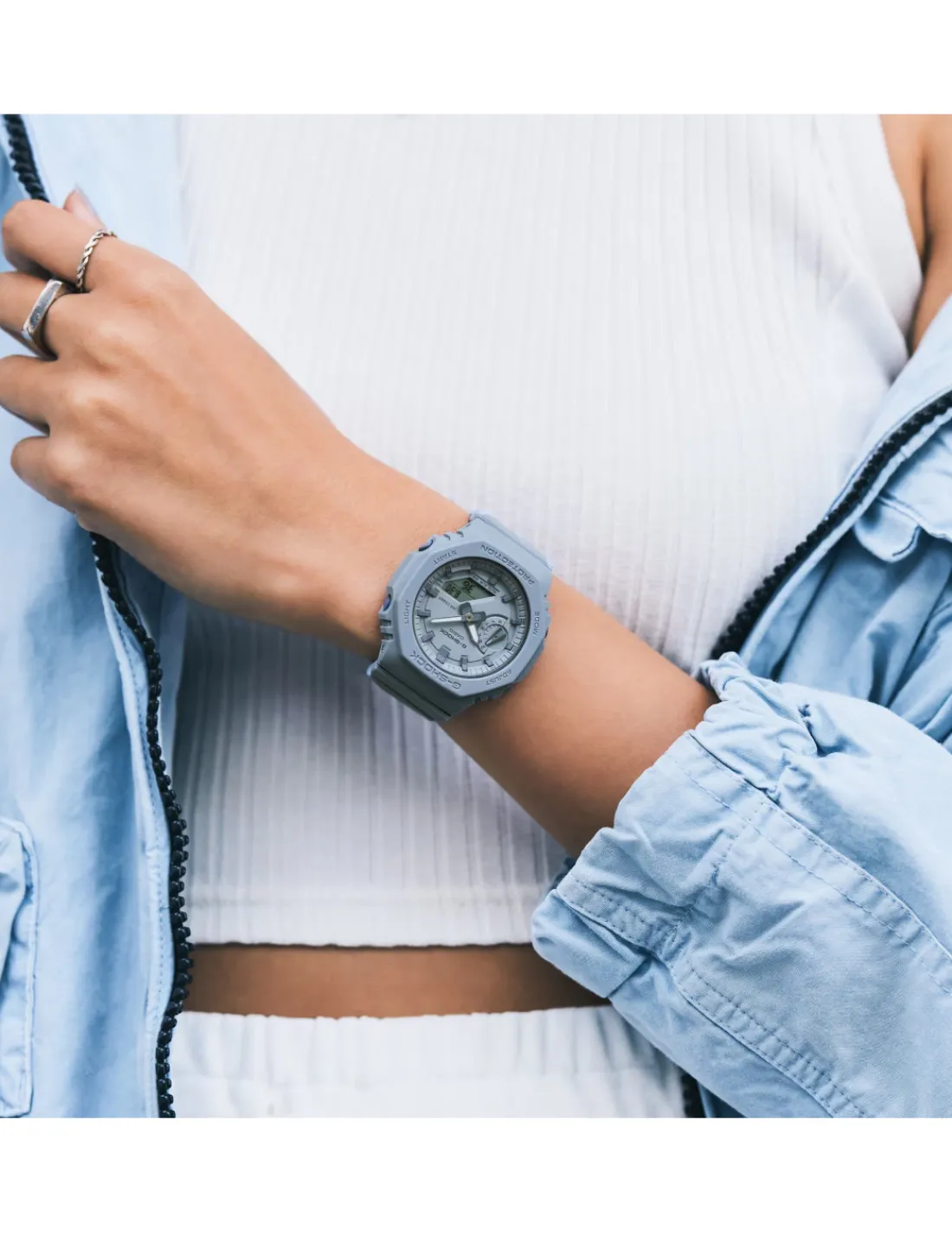 El GMA-S2100BA-2A2ER se caracteriza por un estilo limpio y contemporáneo. Su apariencia minimalista se refleja en sus líneas simples y su estructura compacta. Este reloj está disponible en una selección de colores monocromáticos y ahumados que le aportan un aire elegante y versátil. Estos tonos permiten que se integre fácilmente en cualquier conjunto, siendo adecuado tanto para ocasiones formales como informales.