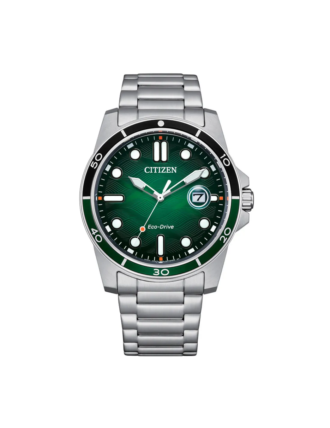 Reloj Citizen Eco Drive Marine 1810 para hombre con caja de acero de 41,5 mm de diámetro, bisel fijo acero con anillo de aluminio, esfera metal gradient color con luminous en agujas e índices, cristal mineral con lupa en ventana de calendario y brazalete de acero con doble pulsador. Movimiento Eco Drive J810 con reserva de carga 8 meses.