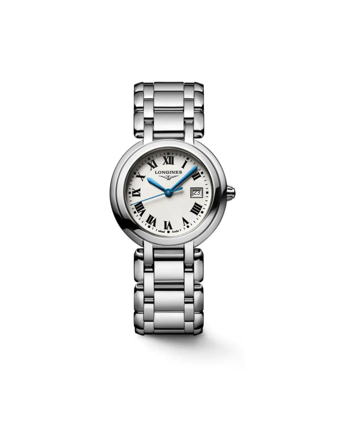 Reloj Longines Primaluna para mujer con caja de acero de 30 mm, esfera plateada con agujas azuladas y números romanos, cristal de zafiro resistente a los arañazos y brazalete de acero. Movimiento de cuarzo Swiss Made. Una pieza con mucha clase que se inspira en la luna y la poesía, como su nombre indica.