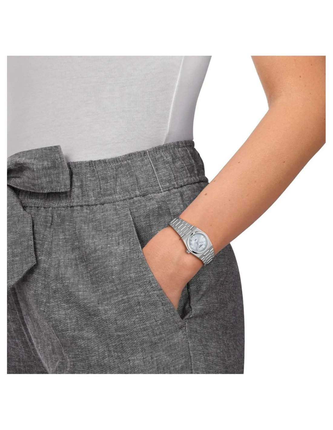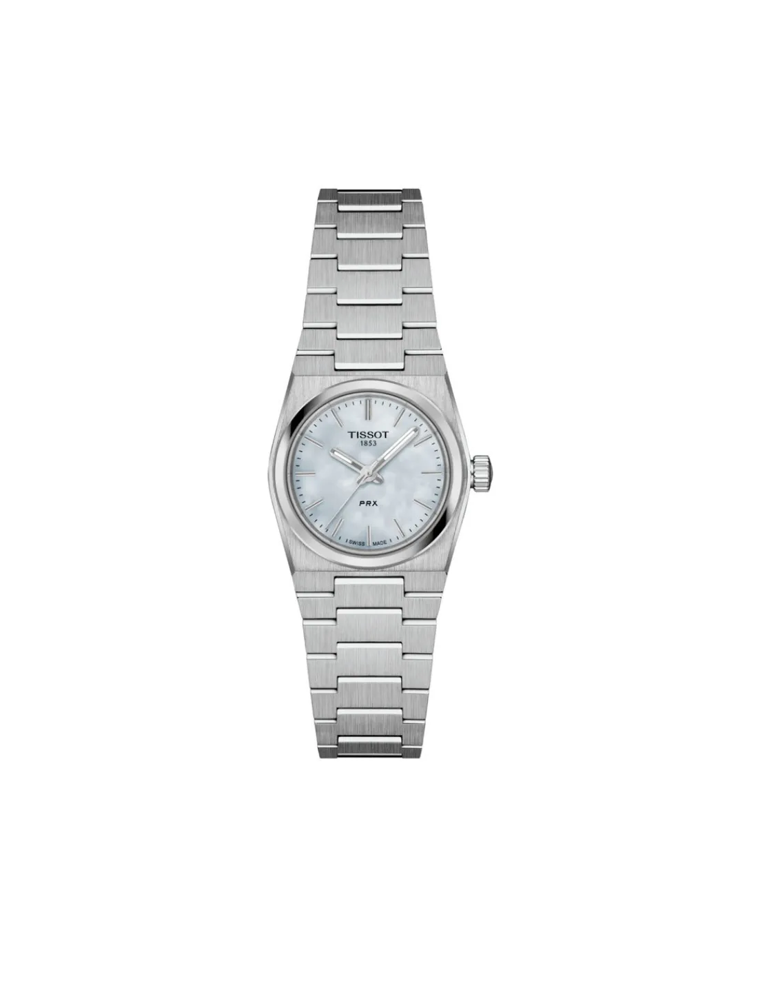 Reloj Tissot PRX con caja de acero inoxidable de 25 mm de diámetro, cristal de zafiro resistente a los arañazos con tratamiento antirreflejos, esfera color madreperla blanca y brazalete de acero. Movimiento de cuarzo Swiss Made.