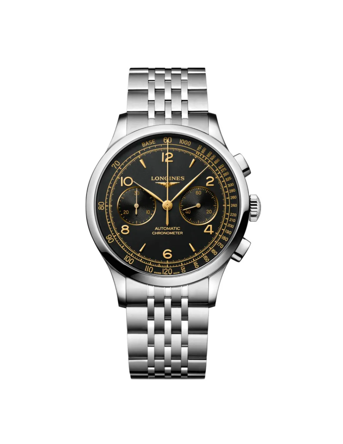 Reloj Longines Record para hombre con brazalete y caja de acero de 40 mm, esfera color negro mate, índices y números árabes y agujas doradas. Un reloj que reúne elegancia clásica, excelencia y con certificado COSC. Movimiento automático Swiss Made con 59 horas de reserva de marcha aproximadamente.