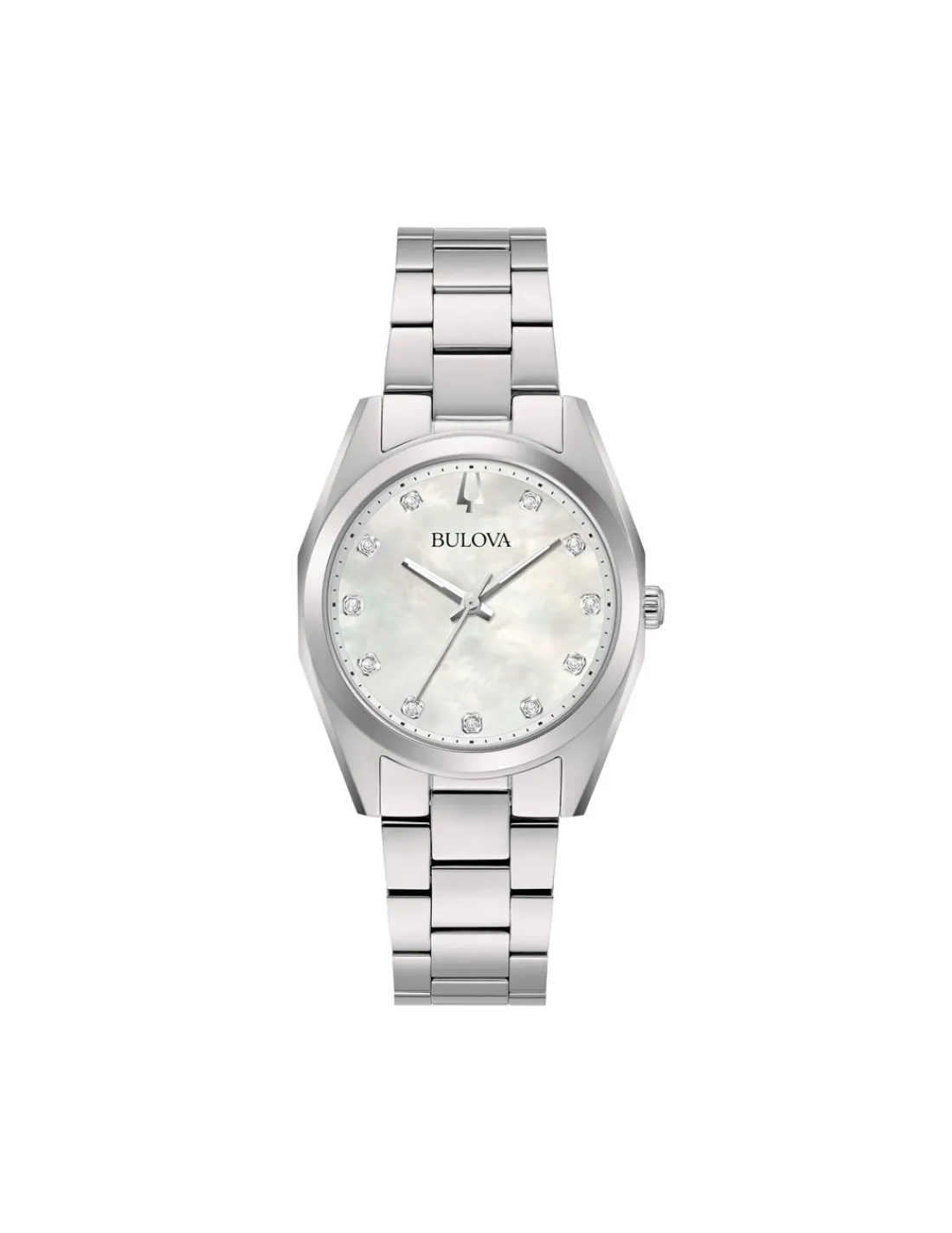Reloj Bulova Surveyor Donna con caja de acero de 31 mm, esfera color madreperla con once diamantes engastados y cristal mineral combinado con brazalete de acero. Movimiento de cuarzo.