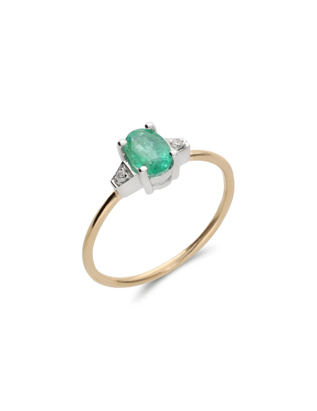 Anillo de oro amarillo-blanco 1ª Ley (750 mmas) con esmeralda oval en el centro y diamantes a cada lado. Una pieza minimalista y sencilla perfecta para combinar con otras joyas.