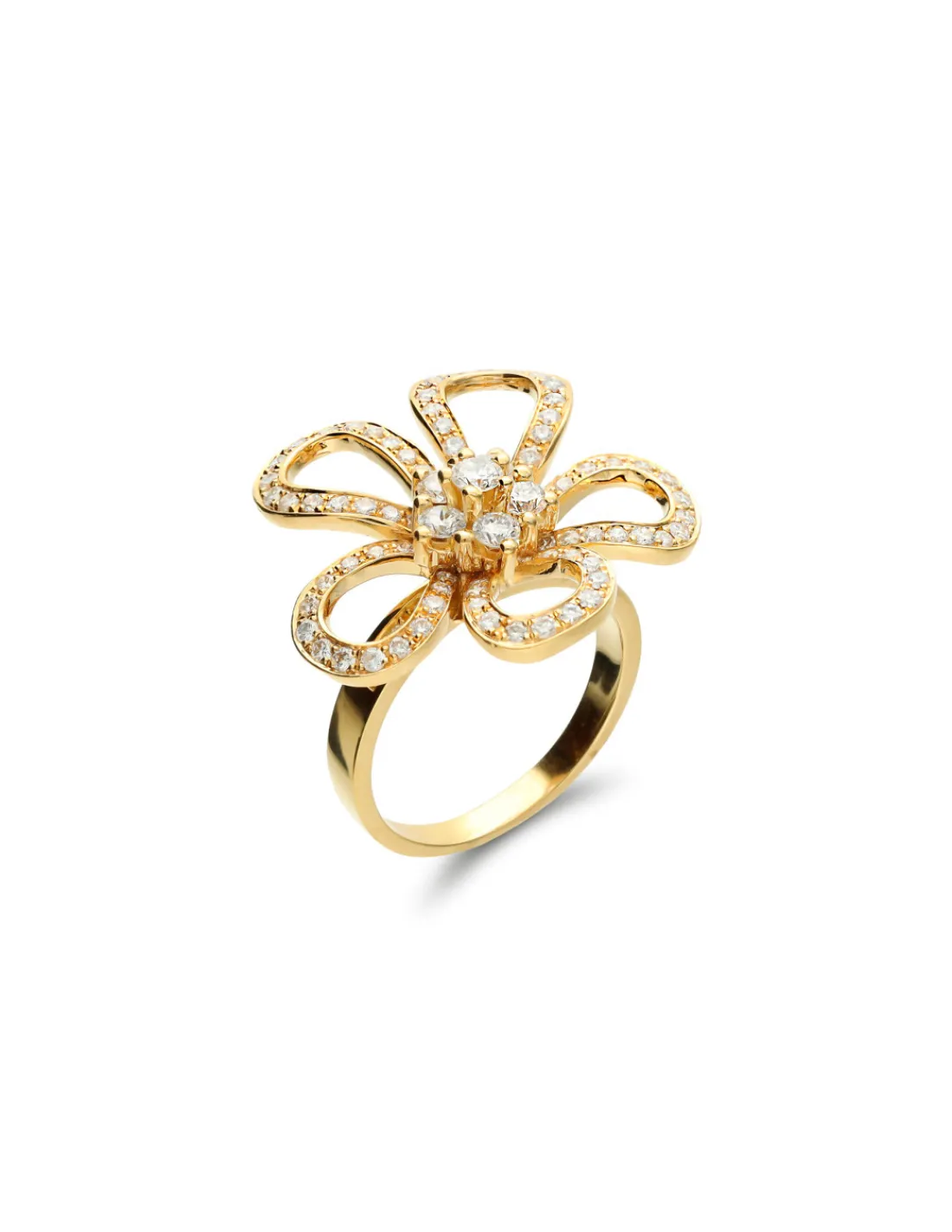 Anillo de oro amarillo 1ª Ley (750 mmas) con un exuberante diseño en forma de flor y diamantes talla brillante engastados que forman un impresionante espectáculo de luces.