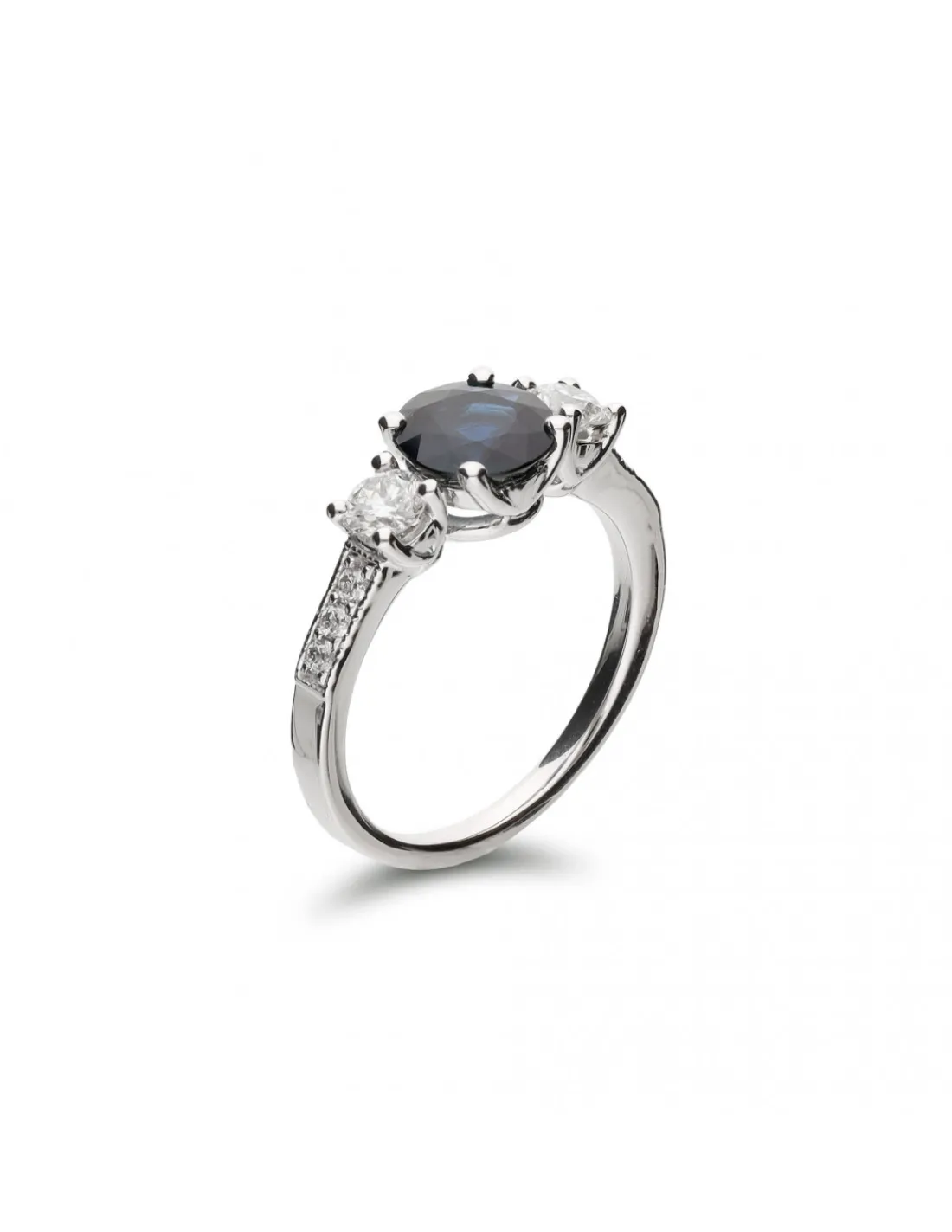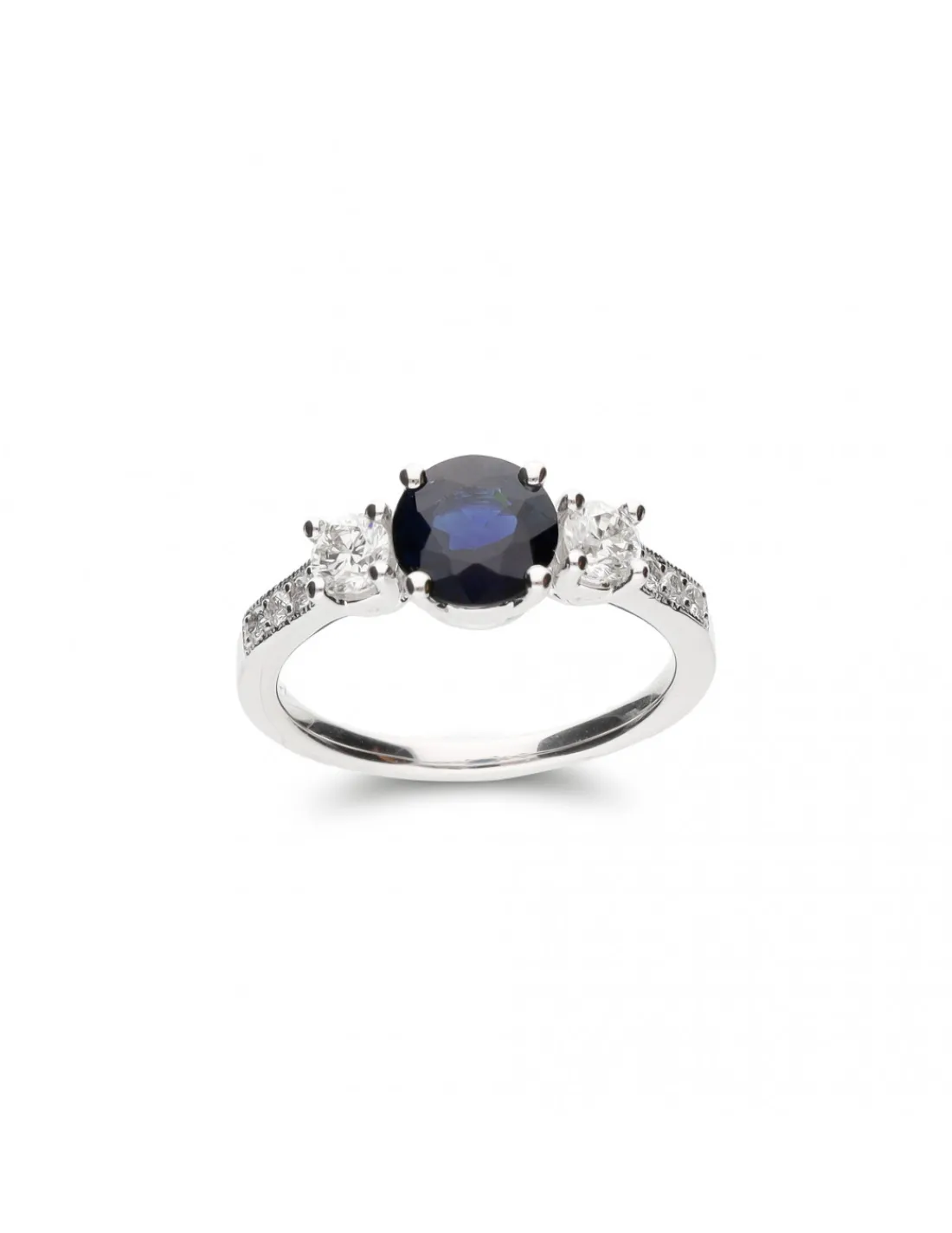Anillo de oro blanco 1ª Ley (750 mmas) con zafiro redondo, diamantes talla brillante a cada lado y diamantes en los laterales del aro. Talla 13.