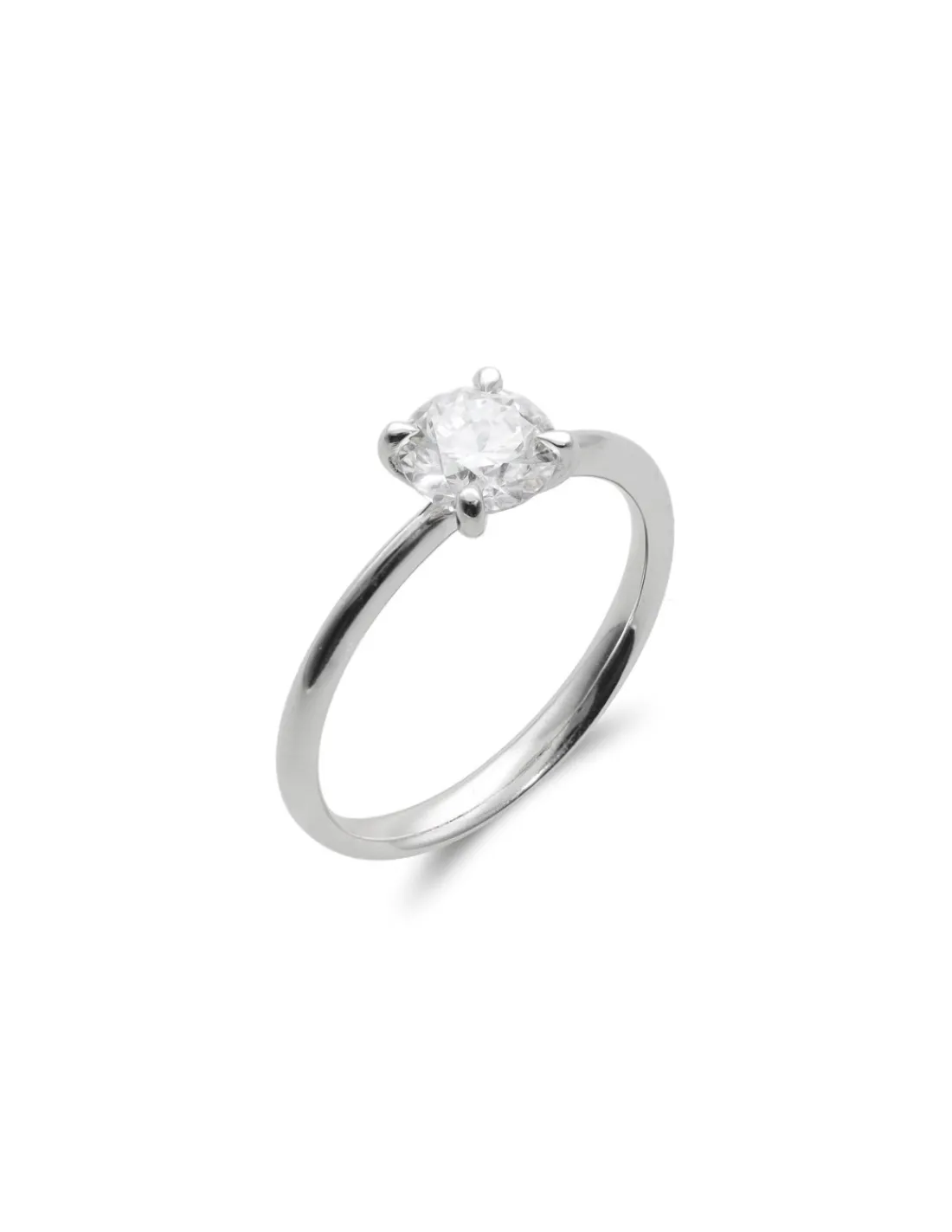 Anillo-Solitario de oro blanco 1ª Ley (750 mmas) con diamante de laboratorio talla brillante en el centro engastado en cuatro garras. Un diseño clásico de solitario, ideal como anillo de compromiso por su sobriedad y elegancia. Talla 16.