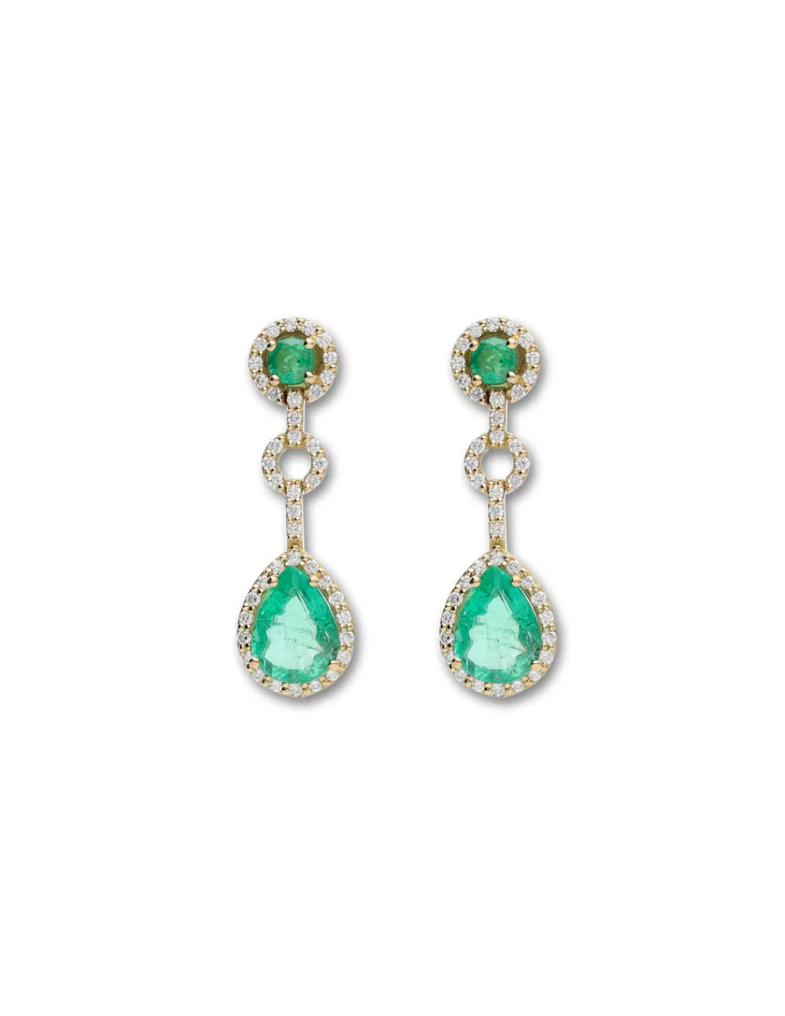 Pendientes de oro amarillo 1ª Ley (750 mmas) con esmeralda redonda rodeada de una roseta de diamantes de la que cuelga una barra de brillantes y a su vez una esmeralda talla pera. Cierre de palillo y presión. Tamaño aproximado 2,9 cm.