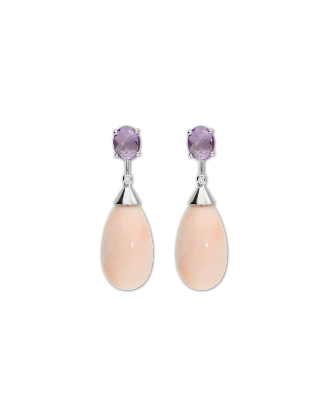 Pendientes de oro blanco 1ª Ley (750 mmas) que combina amatista oval briolette con diamante de la que cuelga una lágrima de coral. Cierra de palillo y presión. Largo aproximado 4,5 cm.