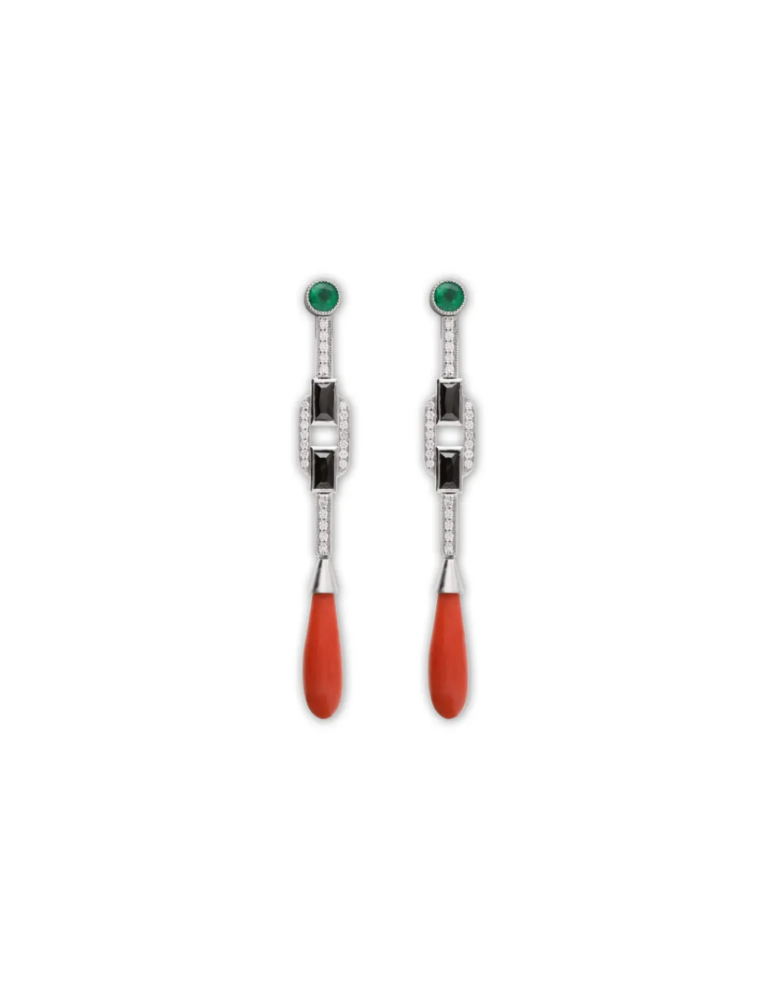 Pendientes de oro blanco 1ª Ley (750 mmas) con esmeralda natural de la que cuelga una barra engastada con diamantes y ónix y a su vez un coral. Una joya que combina la pureza del coral y el brillo del diamante con el misterio del ónix y la intensidad de la esmeralda.