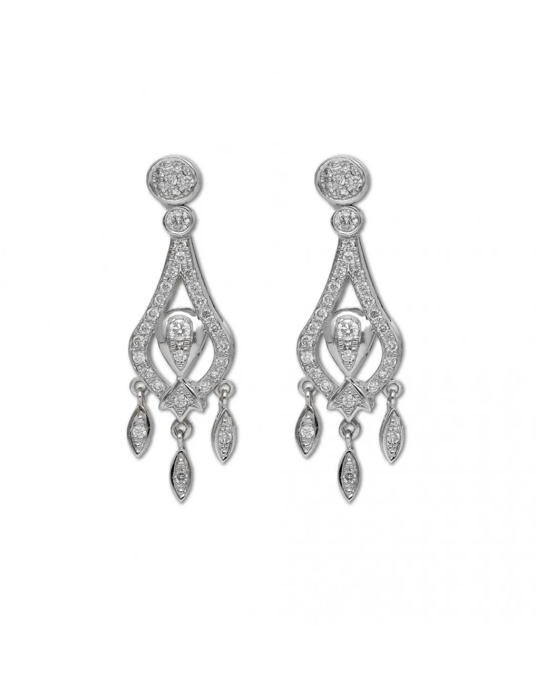 Pendientes de oro blanco 1º Ley (750 mmas) con diamantes naturales engastados en grano y boquilla. Estilo art deco. Ideal para novias. Largo (3,7 cm).