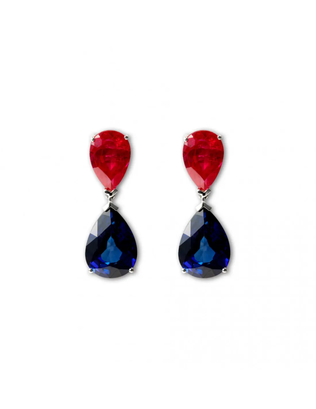 Pendientes Oro Blanco 1ª Ley (750 mmas) con zafiros azules talla pera 14 x 10 mm ( 5,80 ct) y rubíes talla pera 12 x 8 mm. Largo aproximado 2,8 cm. Cierre palillo y presión.