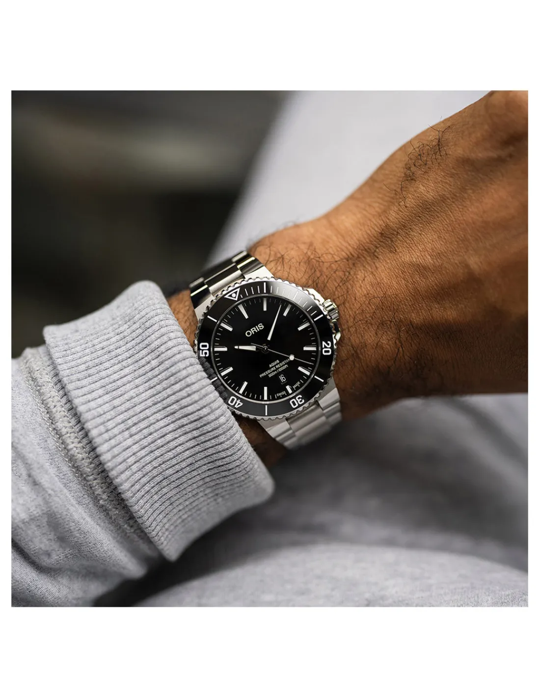 Reloj Oris Aquis Date unisex con caja de 43,5 mm de acero y bisel rotativo unidireccional con encarte cerámico, esfera negra con índices y agujas Superluminova y cristal de zafiro antirreflejos combinado con brazalete de acero. Movimiento automático Swiss Made y 38 horas de reserva de marcha. El Aquis Date es un reloj deportivo, fino y con un alto desempeño, un clásico moderno versátil, reforzado con una resistencia al agua de 300 metros.
