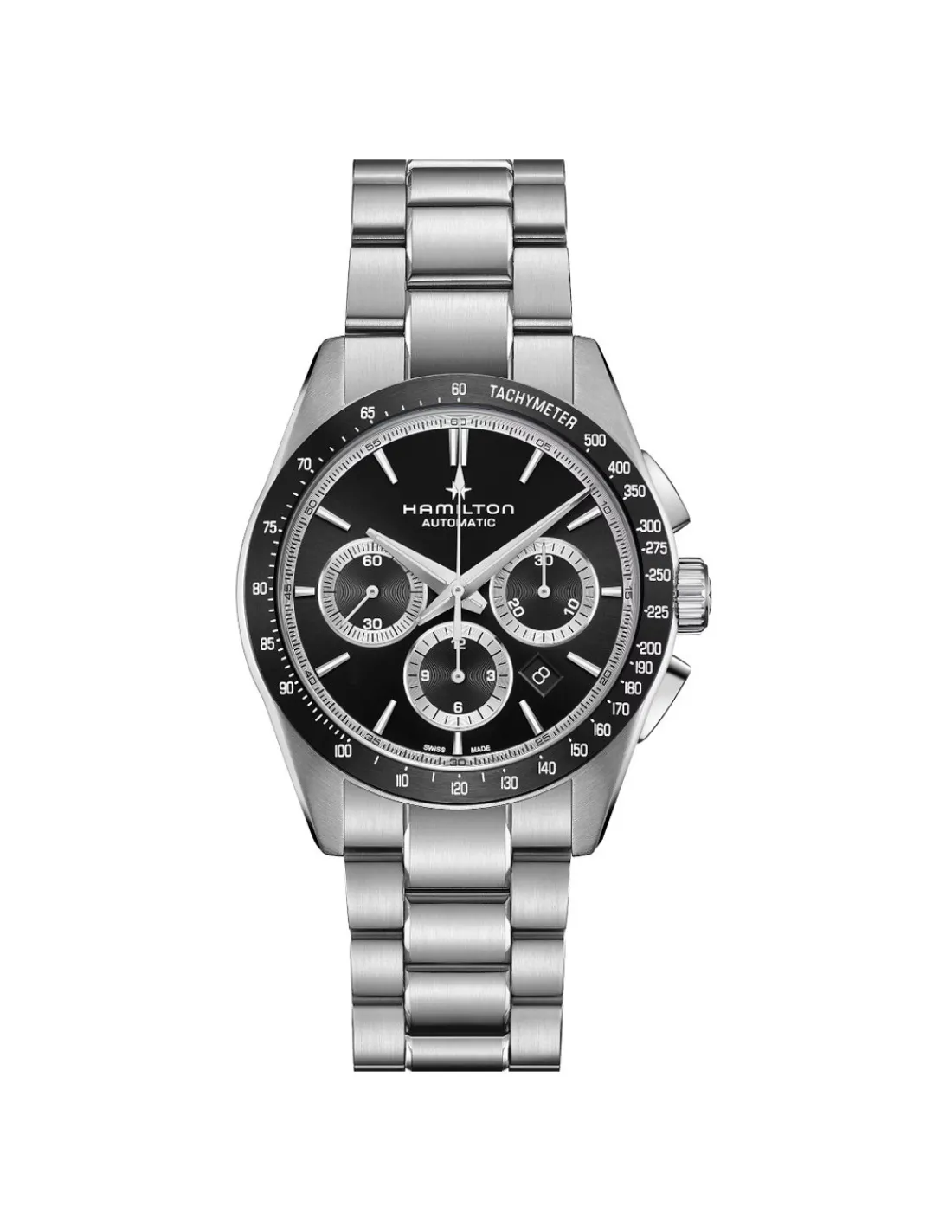 Reloj Hamilton JazzmasterPerformer Auto Chrono H36606130 para hombre con caja de acero, esfera negra y brazalete. Movimiento automático de cronógrafo H-31 y 60 horas de reserva de marcha.
