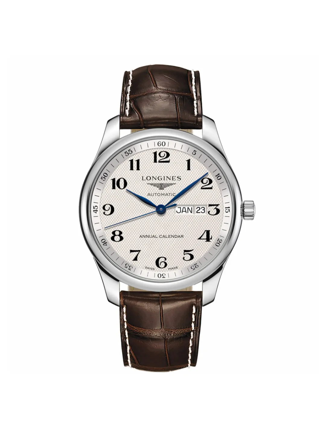 Reloj Longines Master Collection para hombre con caja de 42mm de acero, elegante esfera plateada con motivo «grano de cebada» con números árabes y doble calendario a las 3h, correa de piel de caimán marrón. Movimiento automático Swiss Made. Este reloj es una pieza atemporal de la casa Longines.