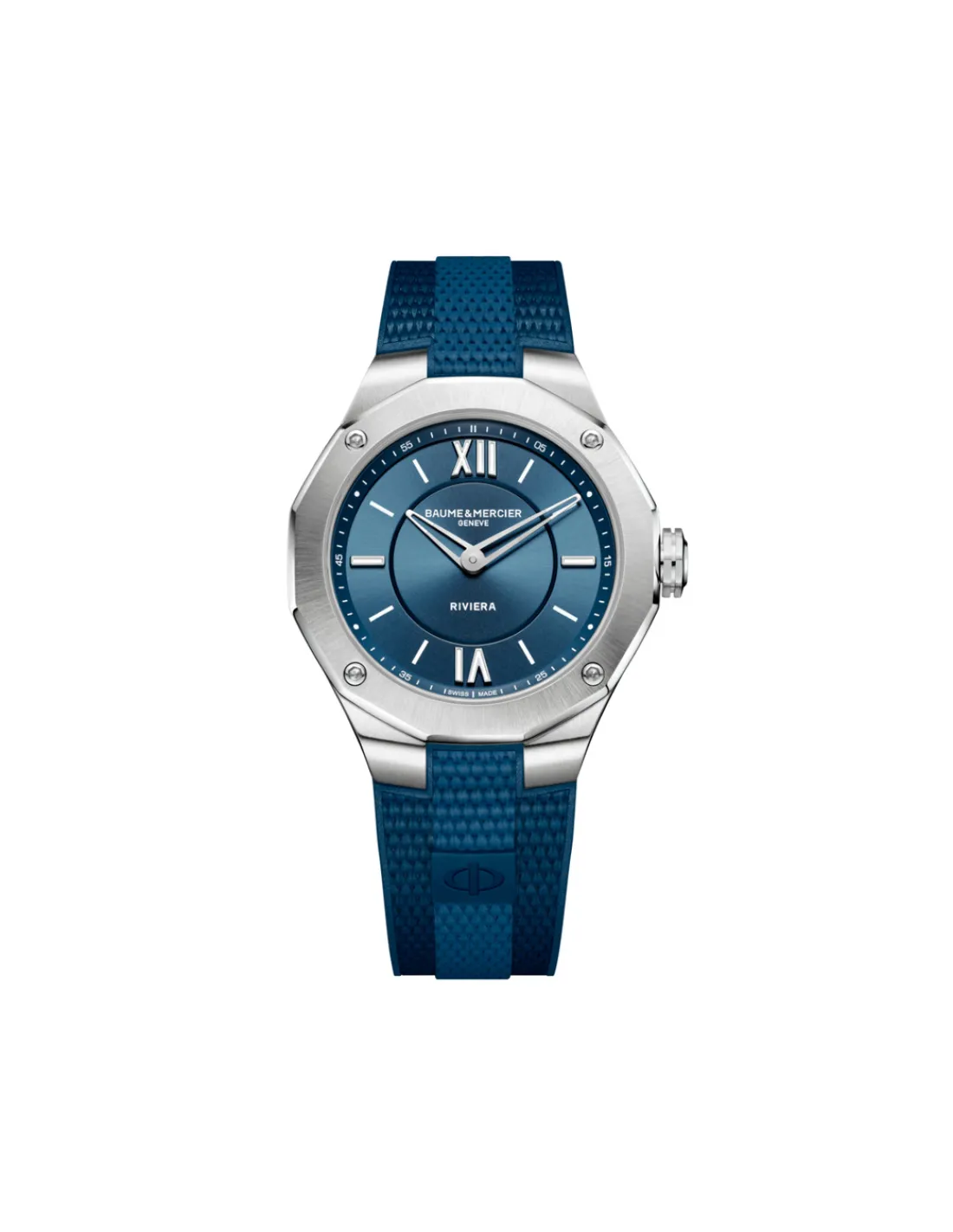 Reloj Baume et Mercier Riviera con caja de acero de 36 mm acompañada de un bisel dodecagonal. Está adornado con una deportiva esfera azul con satinado soleil y correa de caucho con decoración de lona y degradado azul que lo convierte en la elección perfecta para un look deportivo. Movimiento de cuarzo Swiss Made.