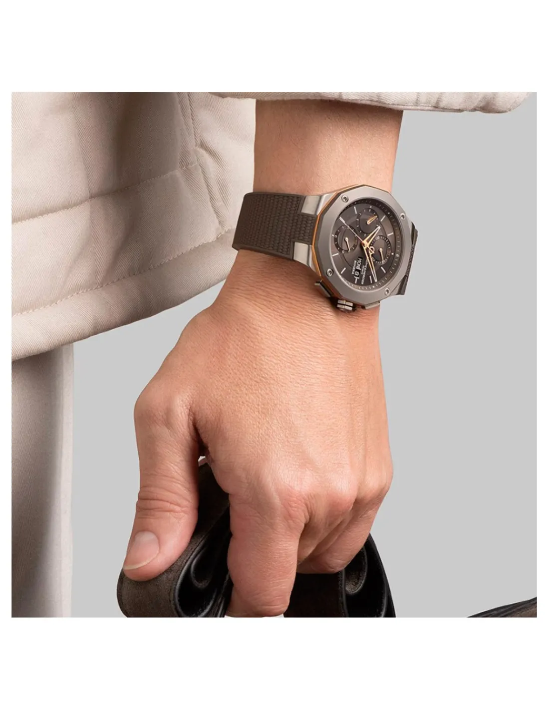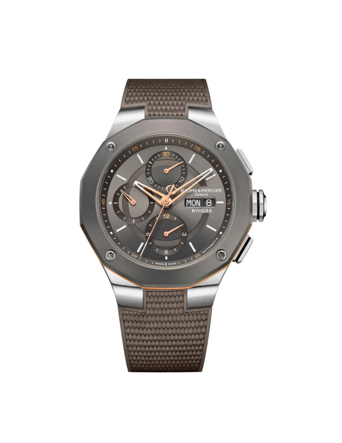 Reloj Baume et Mercier Riviera Cronógrafo con caja de acero de 43 mm y bisel de titanio arenado iluminado por un anillo de oro PVD, esfera color gris pizarra con acabado satinado solar, índices y agujas Superluminova y una correa de caucho gris con decoración de lona. Movimiento automático Valjoux Swiss Made. Emblemático del sport-chic, este reloj ofrece el poder evocador de los modelos originales de los años 70 revisando su ADN. Tiene la forma, el espíritu y la función.