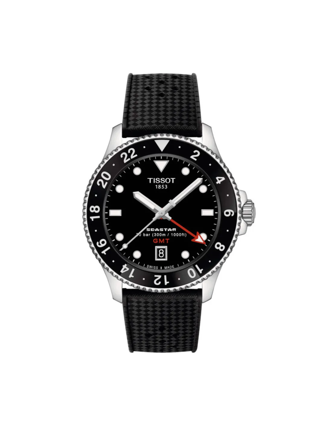 Reloj Tissot Seastar 1000 GMT para hombre con caja de acero inoxidable de 40 mm de diámetro, esfera negra que combina con elementos blancos, cristal de zafiro abombado resistente a los arañazos y correa de goma negra. Su impresionante resistencia al agua hasta una presión de 30 bares se combina con la energía de un movimiento de cuarzo Swiss Made.