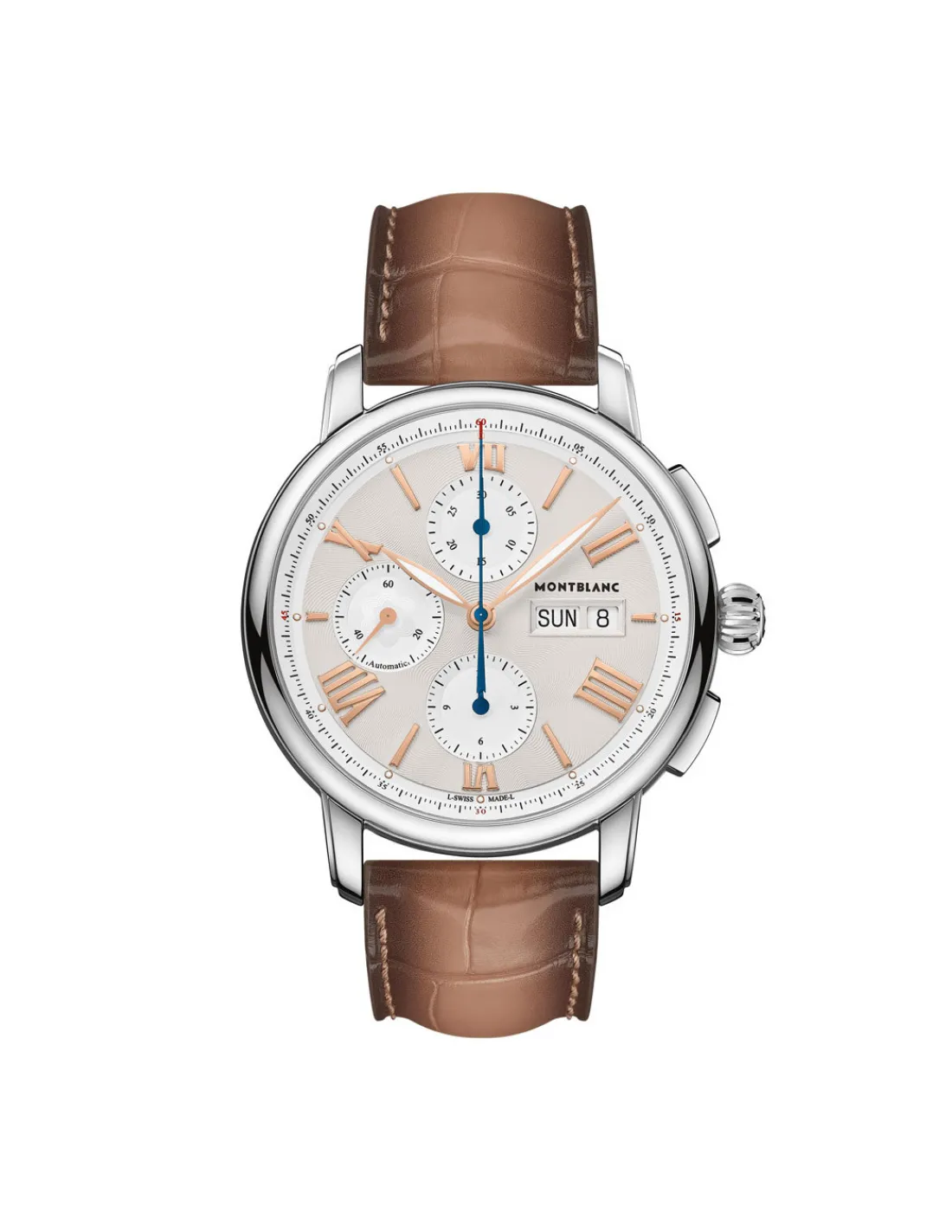 Reloj Montblanc Star Legacy Cronograph para hombre con caja de acero de 43 mm, esfera gilloché color marfil con números romanos y correa de piel de cocodrilo marrón. Inspirado en los relojes de bolsillo que fabricaba Minerva a finales del siglo XIX. Un reloj elegante de líneas actuales. Movimiento cronógrafo automático Swiss Made.