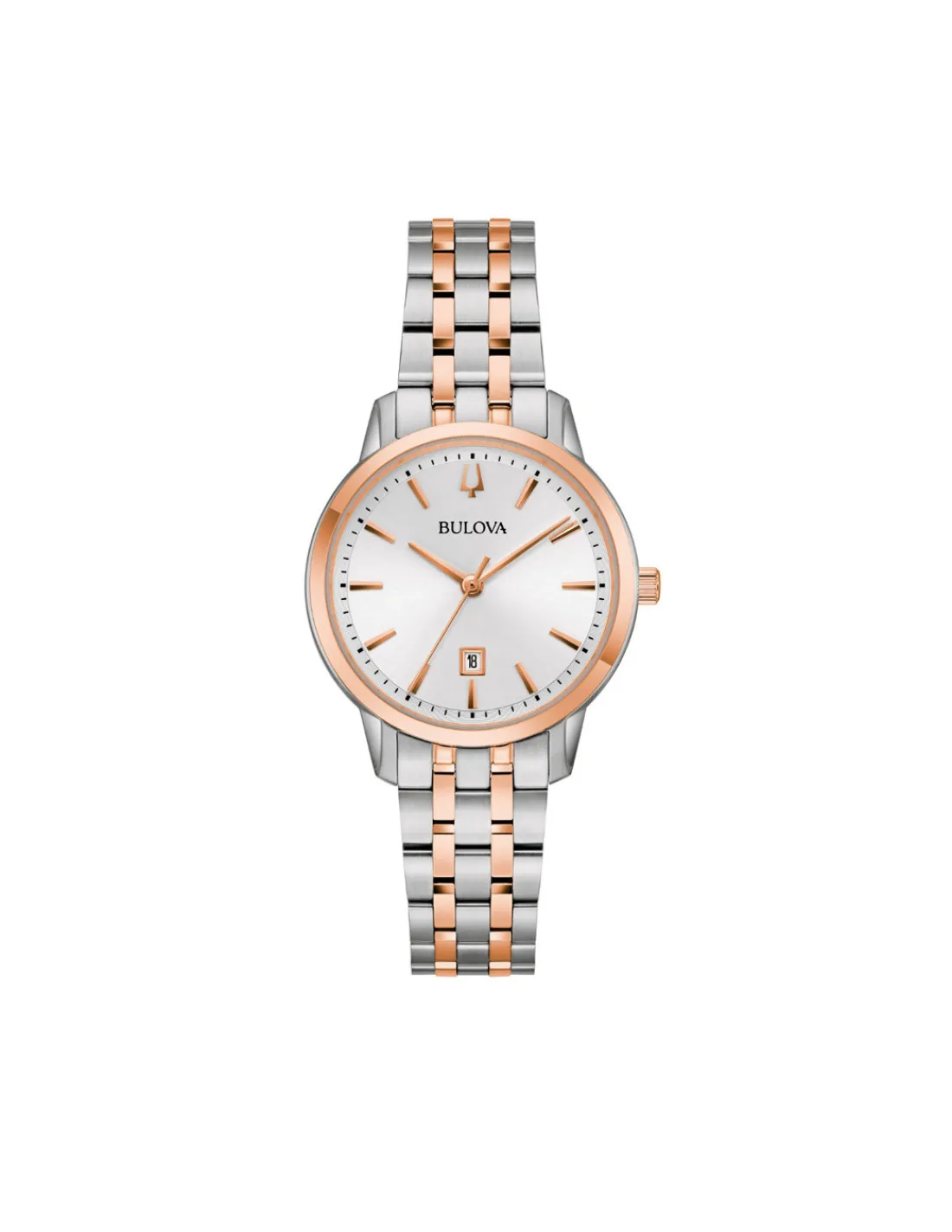 Reloj Bulova Sutton Lady con caja bicolor de acero oro de 31 mm de diámetro, esfera analógica blanca y cristal mineral combinado con brazalete bicolor. Movimiento de cuarzo.