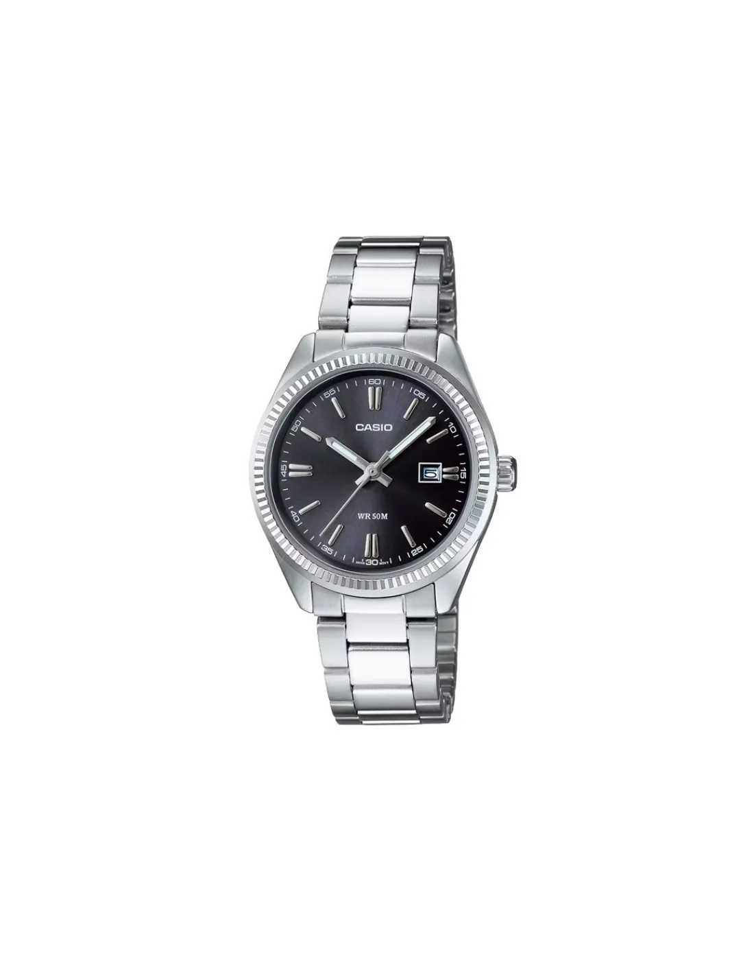 Reloj Casio Timeless LTP-1302PD-1A1VEG con caja de acero inoxidable, esfera negra y brazalete. Movimiento de cuarzo japonés.