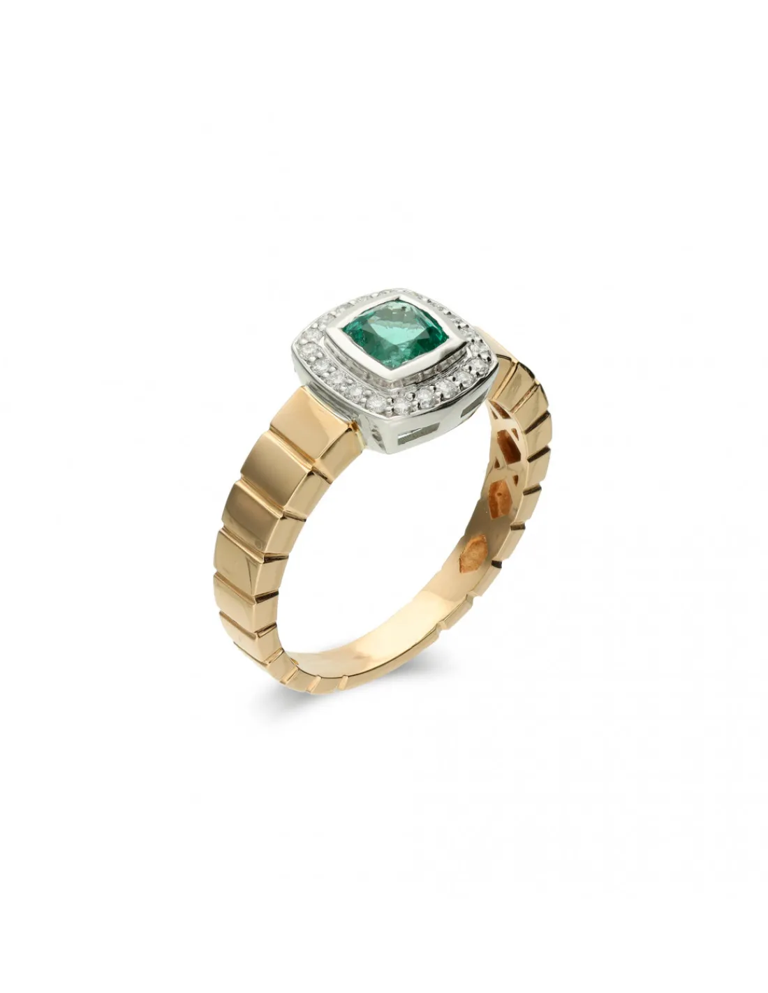 Anillo con aro de oro amarillo 1ª Ley (750 mmas) combinado con frente de oro blanco engastado con esmeralda cuadrada rodeada de diamantes talla brillante. Talla 15.