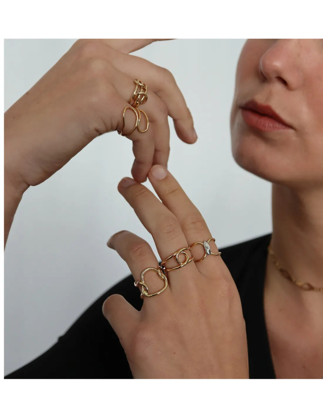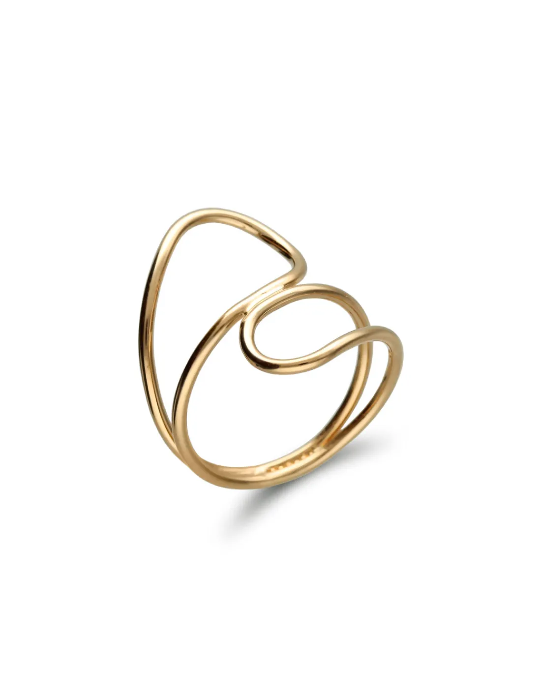 Anillo de oro amarillo 1ª Ley (750 mmas) con doble curva y un original diseño minimalista.