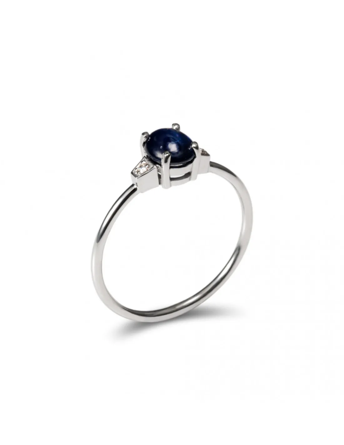 Anillo de oro blanco 1ª Ley (750 mmas) con aro minimalista, zafiro central talla cabujón y diamantes en los laterales. Talla 12 y 15.